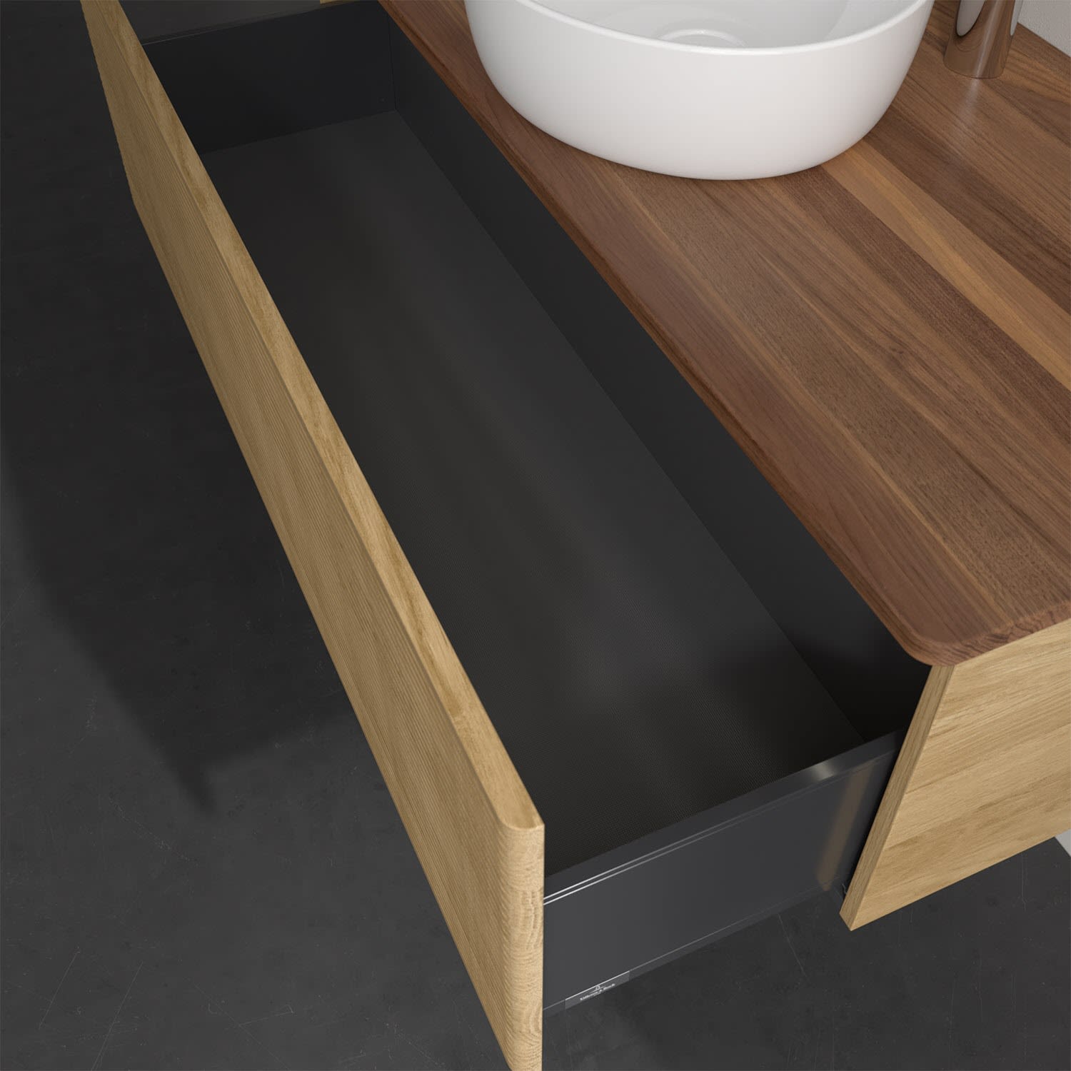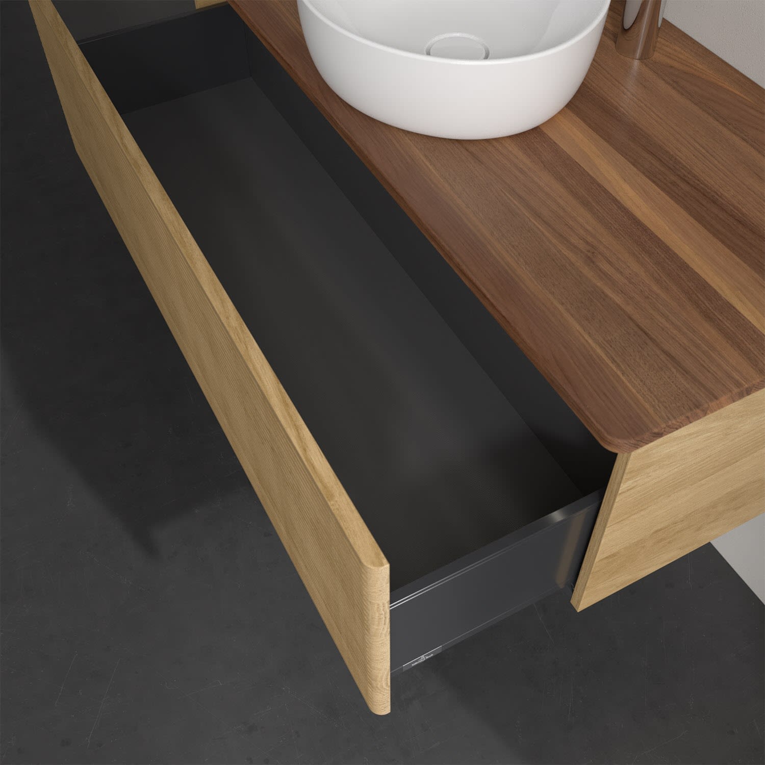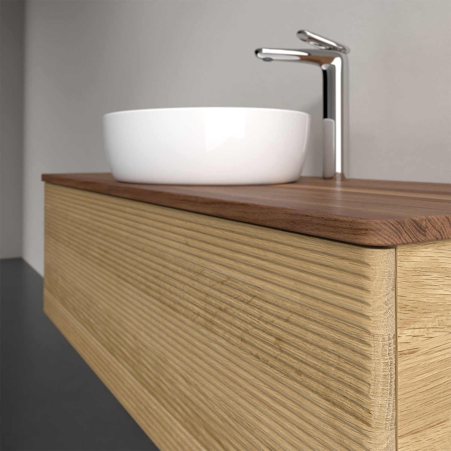 Der wandhängende Antao Waschtischunterschrank von Villeroy & Boch bietet nicht nur jede Menge Stauraum – er ist dank seines naturinspirierten Designs mit seinen abgerundeten Kanten auch noch besonders stilvoll und schafft eine gemütliche Atmosphäre im Badezimmer. Auf der Waschtischplatte bietet sich rechts und links neben dem Waschtisch viel Platz für Zahnbürstenbecher oder Seifenspender. Ein extra hoher Auszug bietet viel Platz, um alles Notwendige zu verstauen und Ordnung zu halten. Öffnen lässt er sich durch leichten Druck auf die strukturierte Front. Dabei aktiviert sich übrigens die Auszugsbeleuchtung in angenehmem Warmweiß. Dank Vollauszug hat man immer alles im Blick und der Antirutschboden verhindert ein Umfallen oder Verrutschen der Gegenstände. Einfach clever! Für eine besonders leichte Pflege sorgt die mehrschichtig deckend lackierte Oberfläche. Bei der Ausführung in Massivholz wird dank des verarbeiteten Massivholzes jedes Möbel zu einem Unikat, das sich durch das lebendige Naturmaterial durch seine einzigartige Struktur und Maserung auszeichnet.