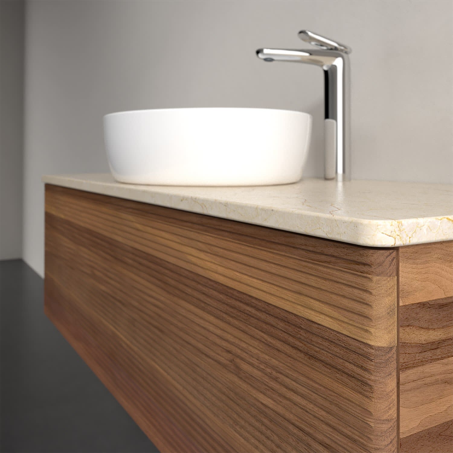 Der wandhängende Antao Waschtischunterschrank von Villeroy & Boch bietet nicht nur jede Menge Stauraum – er ist dank seines naturinspirierten Designs mit seinen abgerundeten Kanten auch noch besonders stilvoll und schafft eine gemütliche Atmosphäre im Badezimmer. Auf der Waschtischplatte bietet sich rechts und links neben dem Waschtisch viel Platz für Zahnbürstenbecher oder Seifenspender. Ein extra hoher Auszug bietet viel Platz, um alles Notwendige zu verstauen und Ordnung zu halten. Öffnen lässt er sich durch leichten Druck auf die strukturierte Front. Dabei aktiviert sich übrigens die Auszugsbeleuchtung in angenehmem Warmweiß. Dank Vollauszug hat man immer alles im Blick und der Antirutschboden verhindert ein Umfallen oder Verrutschen der Gegenstände. Einfach clever! Für eine besonders leichte Pflege sorgt die mehrschichtig deckend lackierte Oberfläche. Bei der Ausführung in Massivholz wird dank des verarbeiteten Massivholzes jedes Möbel zu einem Unikat, das sich durch das lebendige Naturmaterial durch seine einzigartige Struktur und Maserung auszeichnet.