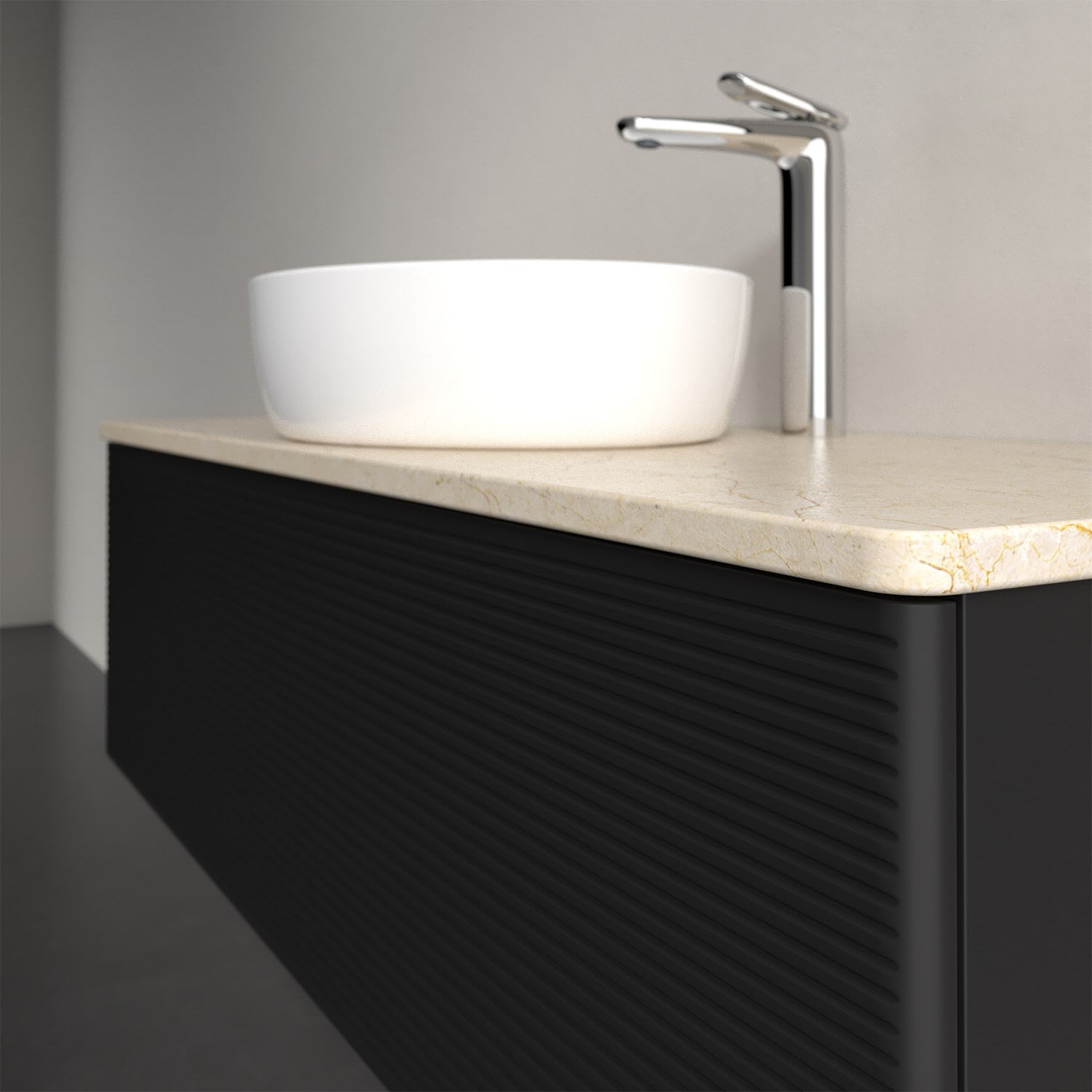 Der wandhängende Antao Waschtischunterschrank von Villeroy & Boch bietet nicht nur jede Menge Stauraum – er ist dank seines naturinspirierten Designs mit seinen abgerundeten Kanten auch noch besonders stilvoll und schafft eine gemütliche Atmosphäre im Badezimmer. Auf der Waschtischplatte bietet sich rechts und links neben dem Waschtisch viel Platz für Zahnbürstenbecher oder Seifenspender. Ein extra hoher Auszug bietet viel Platz, um alles Notwendige zu verstauen und Ordnung zu halten. Öffnen lässt er sich durch leichten Druck auf die strukturierte Front. Dabei aktiviert sich übrigens die Auszugsbeleuchtung in angenehmem Warmweiß. Dank Vollauszug hat man immer alles im Blick und der Antirutschboden verhindert ein Umfallen oder Verrutschen der Gegenstände. Einfach clever! Für eine besonders leichte Pflege sorgt die mehrschichtig deckend lackierte Oberfläche. Bei der Ausführung in Massivholz wird dank des verarbeiteten Massivholzes jedes Möbel zu einem Unikat, das sich durch das lebendige Naturmaterial durch seine einzigartige Struktur und Maserung auszeichnet.
