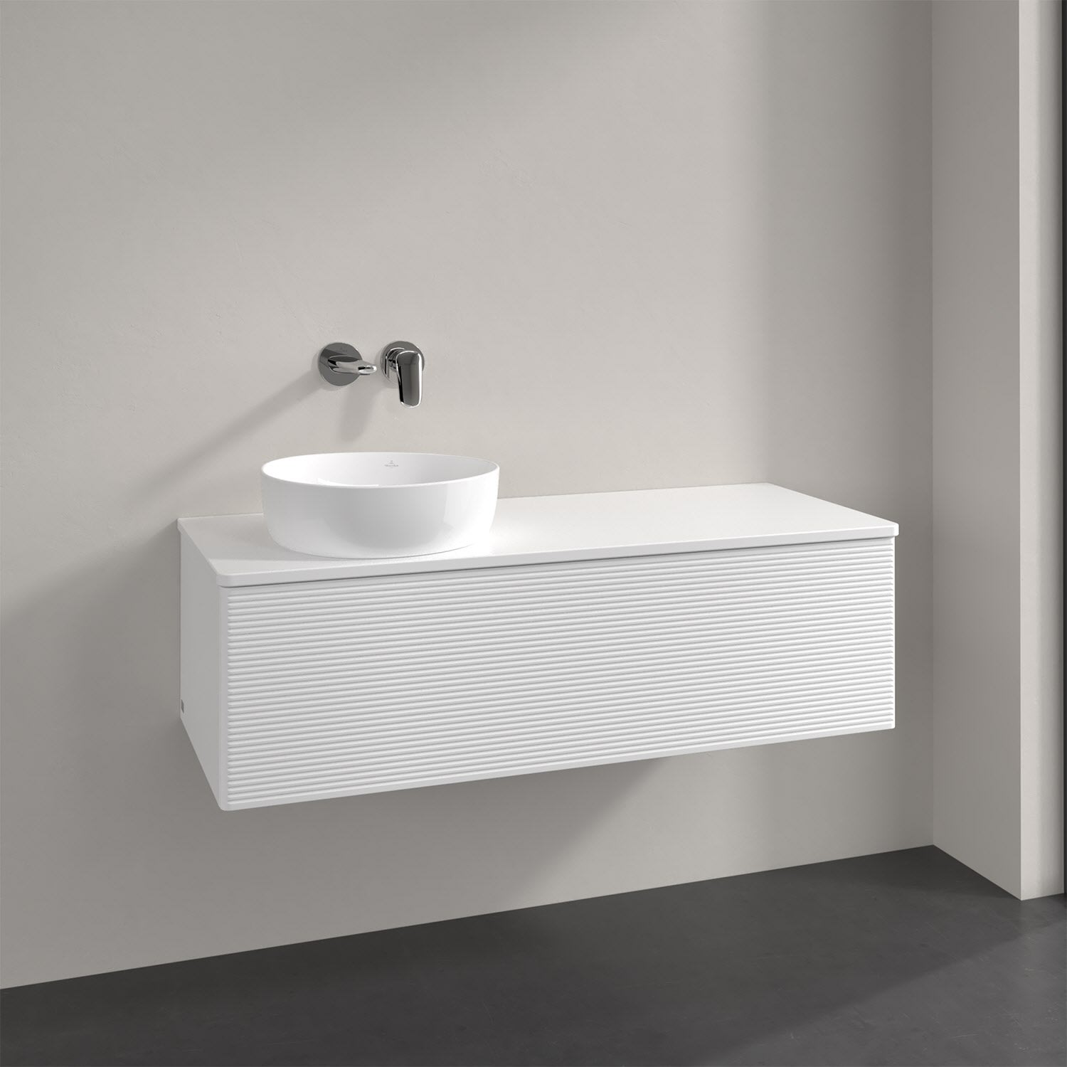 Villeroy & Boch Antao Waschbeckenunterschrank, 120 x 36 cm, 1 Auszug mit LED-Licht, Front mit Struktur, mit Hahnloch, für Waschtisch links