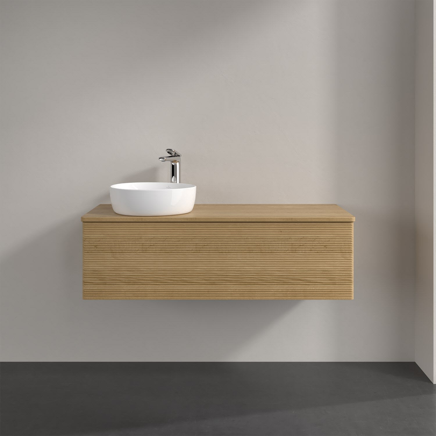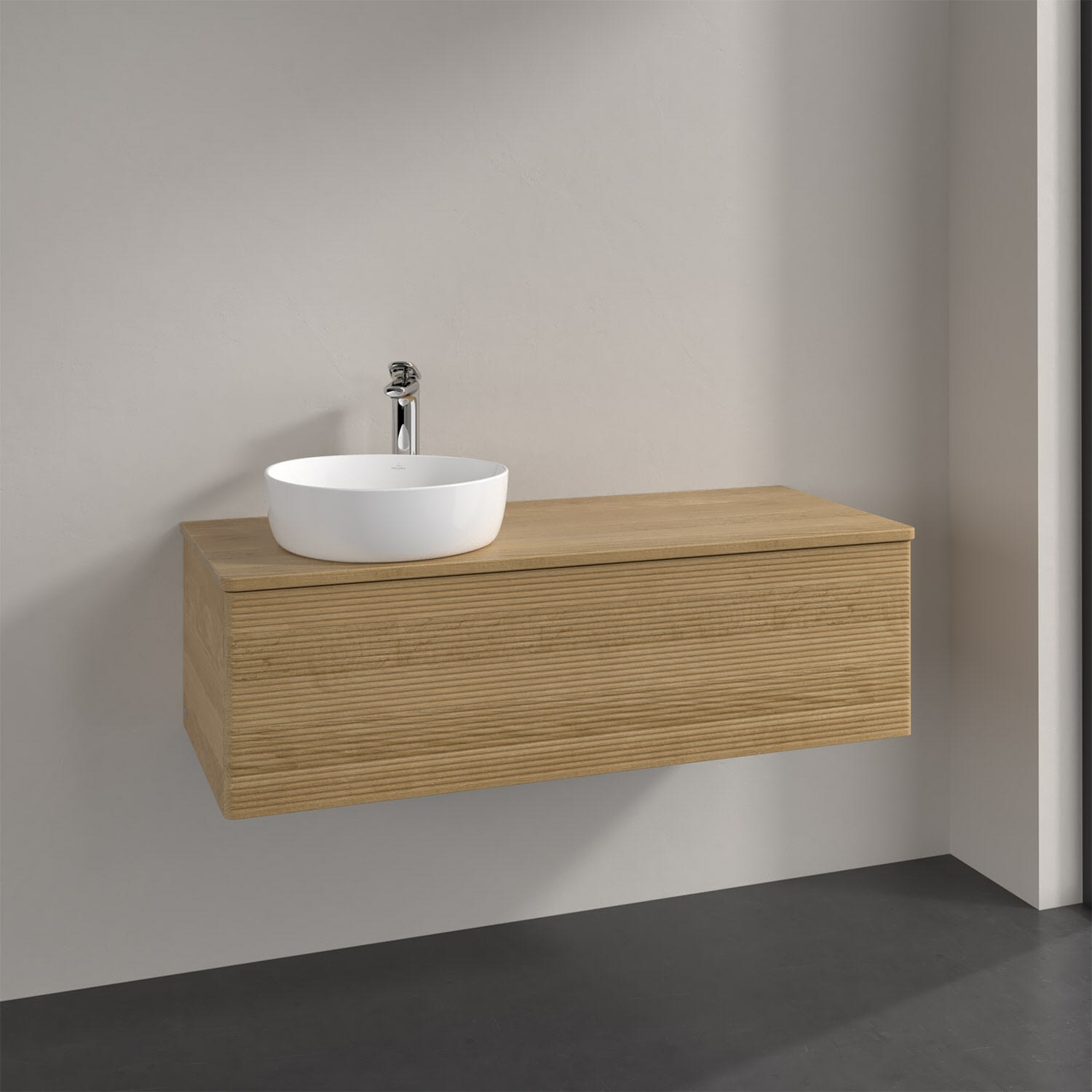 Villeroy & Boch Antao Waschbeckenunterschrank, 120 x 36 cm, 1 Auszug mit LED-Licht, Front mit Struktur, mit Hahnloch, für Waschtisch links
