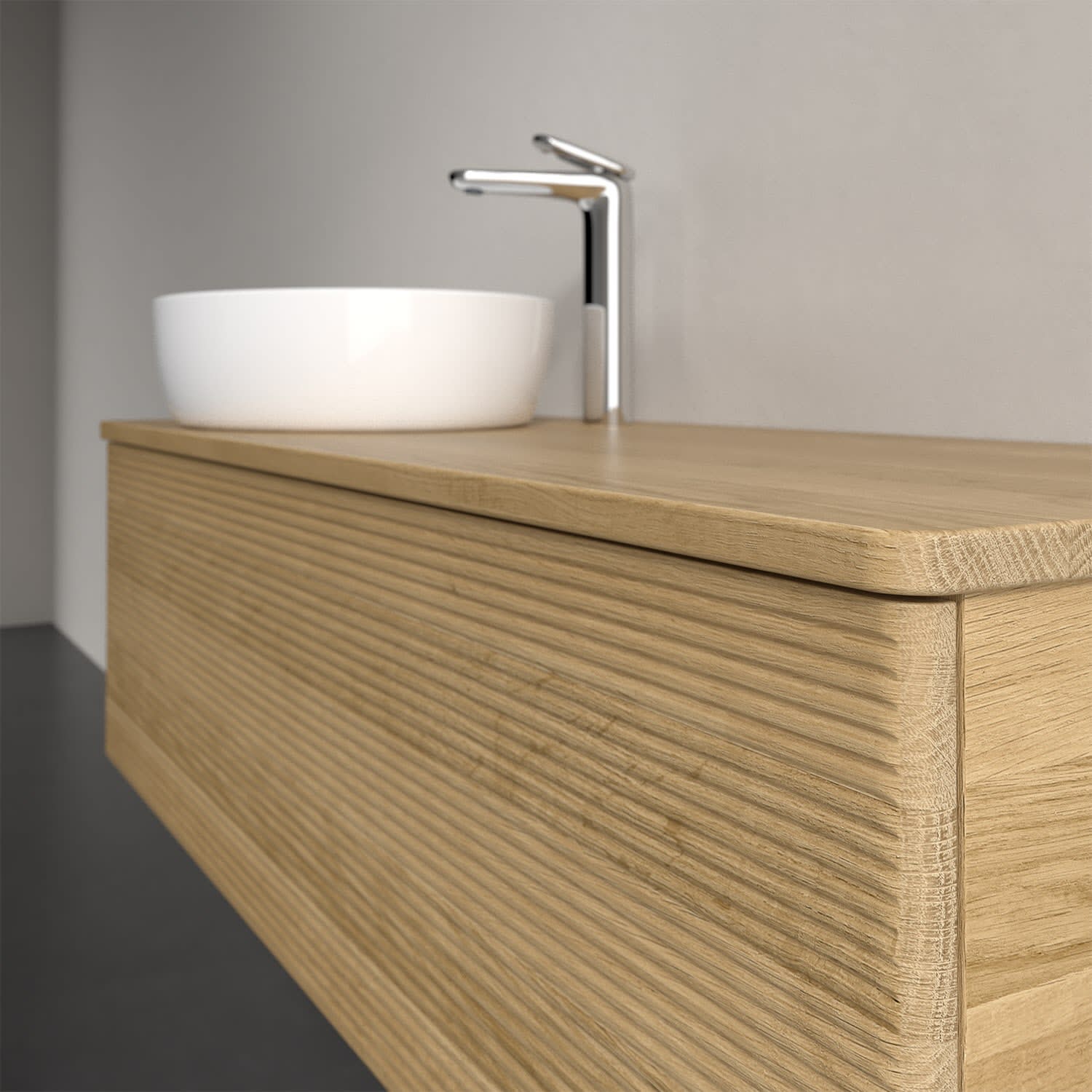 Der wandhängende Antao Waschtischunterschrank von Villeroy & Boch bietet nicht nur jede Menge Stauraum – er ist dank seines naturinspirierten Designs mit seinen abgerundeten Kanten auch noch besonders stilvoll und schafft eine gemütliche Atmosphäre im Badezimmer. Auf der Waschtischplatte bietet sich seitlich des Waschtischs viel Platz für Zahnbürstenbecher oder Seifenspender. Ein extra hoher Auszug bietet viel Platz, um alles Notwendige zu verstauen und Ordnung zu halten. Öffnen lässt er sich durch leichten Druck auf die strukturierte Front. Dabei aktiviert sich übrigens die Auszugsbeleuchtung in angenehmem Warmweiß. Dank Vollauszug hat man immer alles im Blick und der Antirutschboden verhindert ein Umfallen oder Verrutschen der Gegenstände. Einfach clever! Für eine besonders leichte Pflege sorgt die mehrschichtig deckend lackierte Oberfläche. Bei der Ausführung in Massivholz wird dank des verarbeiteten Massivholzes jedes Möbel zu einem Unikat, das sich durch das lebendige Naturmaterial durch seine einzigartige Struktur und Maserung auszeichnet.