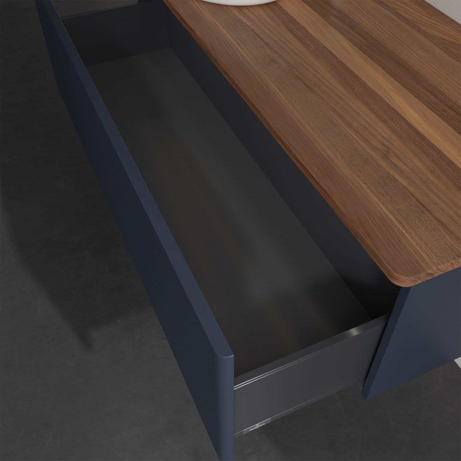 Der wandhängende Antao Waschtischunterschrank von Villeroy & Boch bietet nicht nur jede Menge Stauraum – er ist dank seines naturinspirierten Designs mit seinen abgerundeten Kanten auch noch besonders stilvoll und schafft eine gemütliche Atmosphäre im Badezimmer. Auf der Waschtischplatte bietet sich seitlich des Waschtischs viel Platz für Zahnbürstenbecher oder Seifenspender. Ein extra hoher Auszug bietet viel Platz, um alles Notwendige zu verstauen und Ordnung zu halten. Öffnen lässt er sich durch leichten Druck auf die strukturierte Front. Dabei aktiviert sich übrigens die Auszugsbeleuchtung in angenehmem Warmweiß. Dank Vollauszug hat man immer alles im Blick und der Antirutschboden verhindert ein Umfallen oder Verrutschen der Gegenstände. Einfach clever! Für eine besonders leichte Pflege sorgt die mehrschichtig deckend lackierte Oberfläche. Bei der Ausführung in Massivholz wird dank des verarbeiteten Massivholzes jedes Möbel zu einem Unikat, das sich durch das lebendige Naturmaterial durch seine einzigartige Struktur und Maserung auszeichnet.