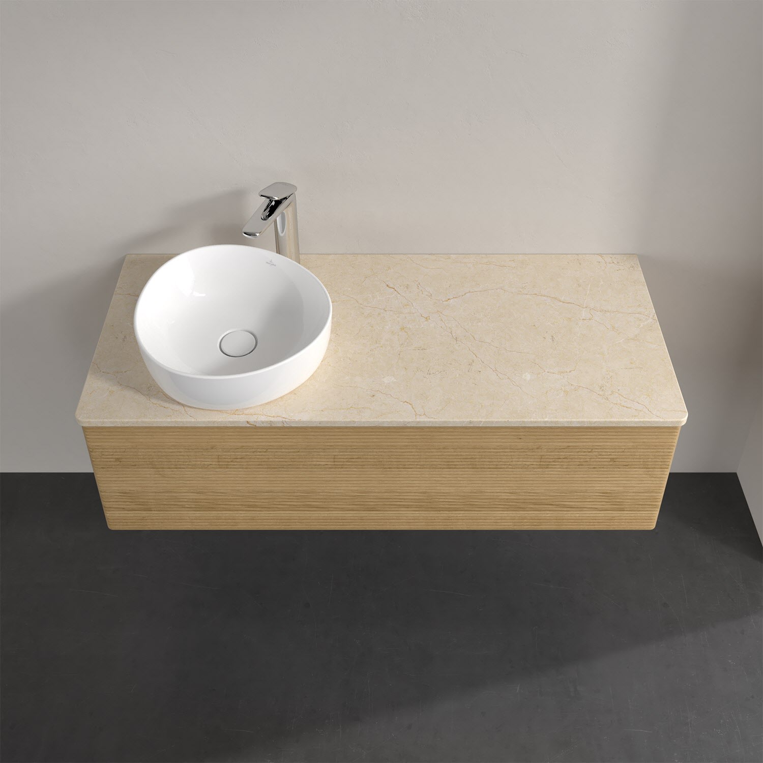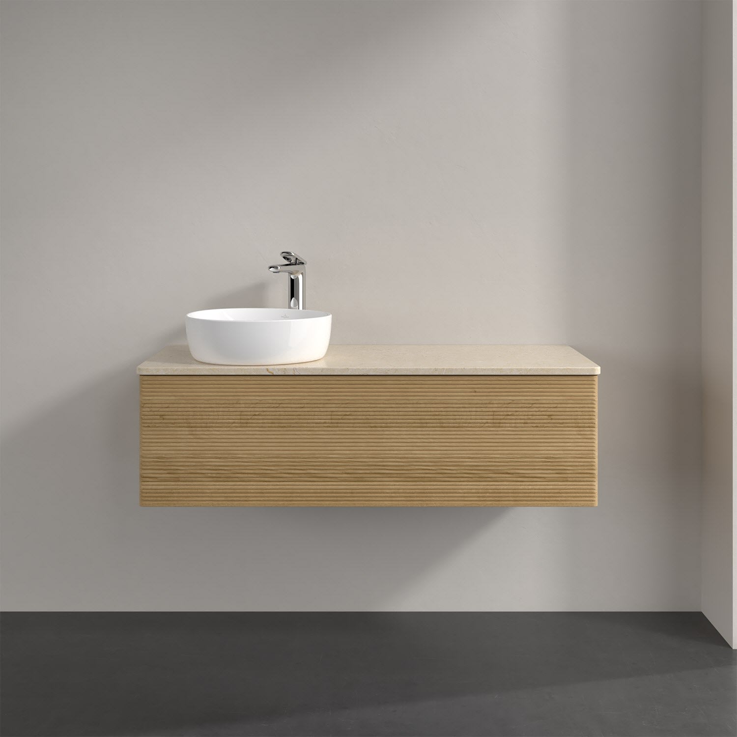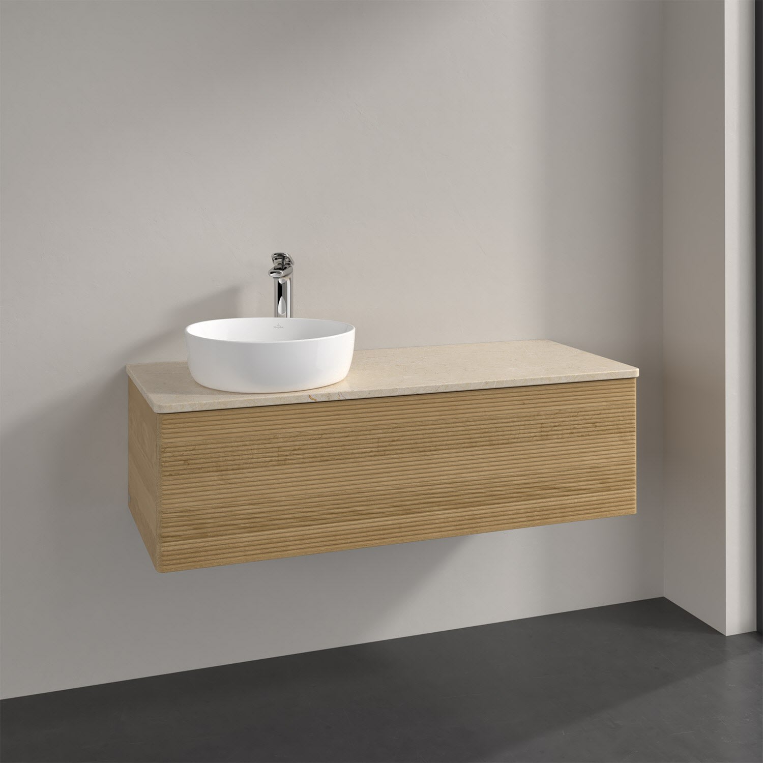 Villeroy & Boch Antao Waschbeckenunterschrank, 120 x 36 cm, 1 Auszug mit LED-Licht, Front mit Struktur, mit Hahnloch, für Waschtisch links