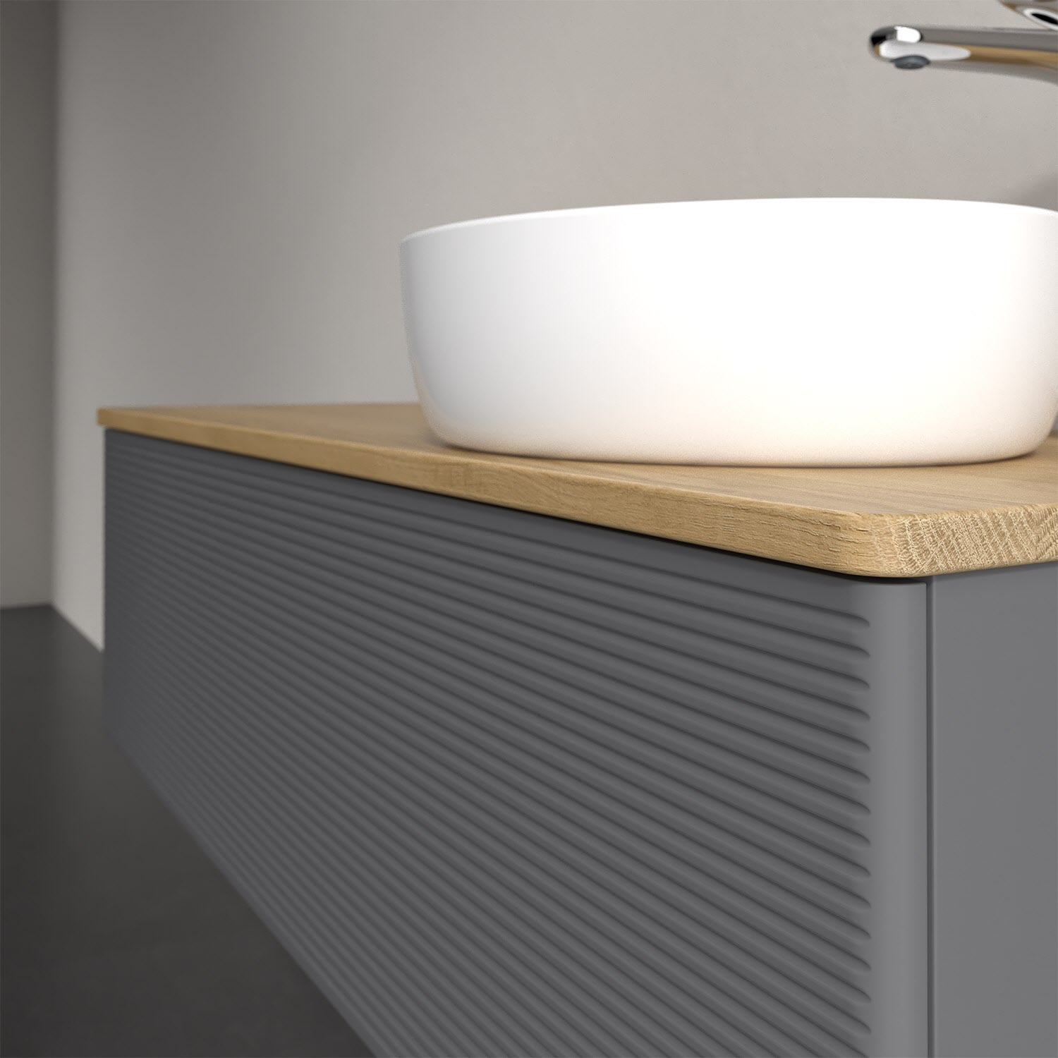 Der wandhängende Antao Waschtischunterschrank von Villeroy & Boch bietet nicht nur jede Menge Stauraum – er ist dank seines naturinspirierten Designs mit seinen abgerundeten Kanten auch noch besonders stilvoll und schafft eine gemütliche Atmosphäre im Badezimmer. Auf der Waschtischplatte bietet sich seitlich des Waschtischs viel Platz für Zahnbürstenbecher oder Seifenspender. Ein extra hoher Auszug bietet viel Platz, um alles Notwendige zu verstauen und Ordnung zu halten. Öffnen lässt er sich durch leichten Druck auf die strukturierte Front. Dabei aktiviert sich übrigens die Auszugsbeleuchtung in angenehmem Warmweiß. Dank Vollauszug hat man immer alles im Blick und der Antirutschboden verhindert ein Umfallen oder Verrutschen der Gegenstände. Einfach clever! Für eine besonders leichte Pflege sorgt die mehrschichtig deckend lackierte Oberfläche. Bei der Ausführung in Massivholz wird dank des verarbeiteten Massivholzes jedes Möbel zu einem Unikat, das sich durch das lebendige Naturmaterial durch seine einzigartige Struktur und Maserung auszeichnet.