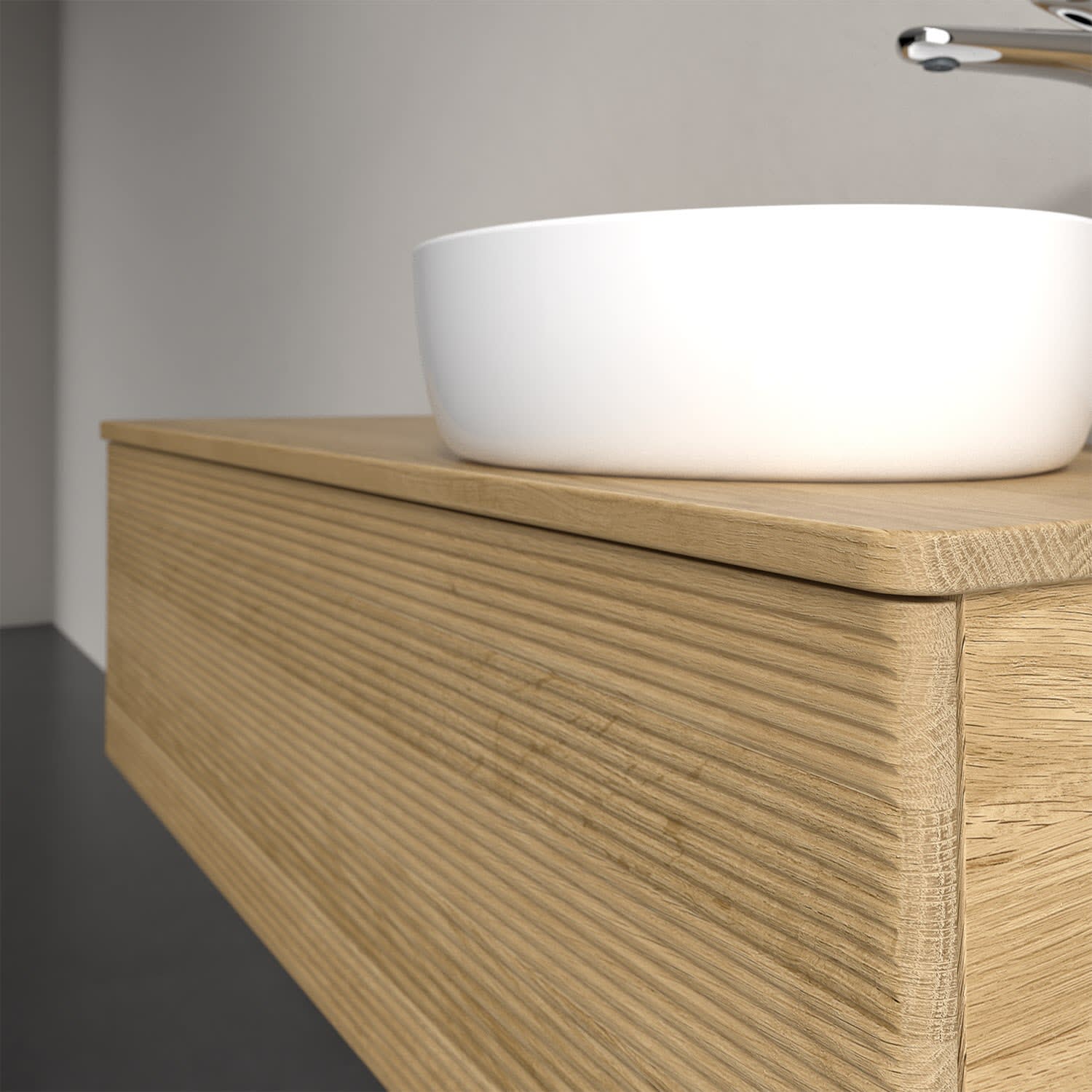 Der wandhängende Antao Waschtischunterschrank von Villeroy & Boch bietet nicht nur jede Menge Stauraum – er ist dank seines naturinspirierten Designs mit seinen abgerundeten Kanten auch noch besonders stilvoll und schafft eine gemütliche Atmosphäre im Badezimmer. Auf der Waschtischplatte bietet sich seitlich des Waschtischs viel Platz für Zahnbürstenbecher oder Seifenspender. Ein extra hoher Auszug bietet viel Platz, um alles Notwendige zu verstauen und Ordnung zu halten. Öffnen lässt er sich durch leichten Druck auf die strukturierte Front. Dabei aktiviert sich übrigens die Auszugsbeleuchtung in angenehmem Warmweiß. Dank Vollauszug hat man immer alles im Blick und der Antirutschboden verhindert ein Umfallen oder Verrutschen der Gegenstände. Einfach clever! Für eine besonders leichte Pflege sorgt die mehrschichtig deckend lackierte Oberfläche. Bei der Ausführung in Massivholz wird dank des verarbeiteten Massivholzes jedes Möbel zu einem Unikat, das sich durch das lebendige Naturmaterial durch seine einzigartige Struktur und Maserung auszeichnet.
