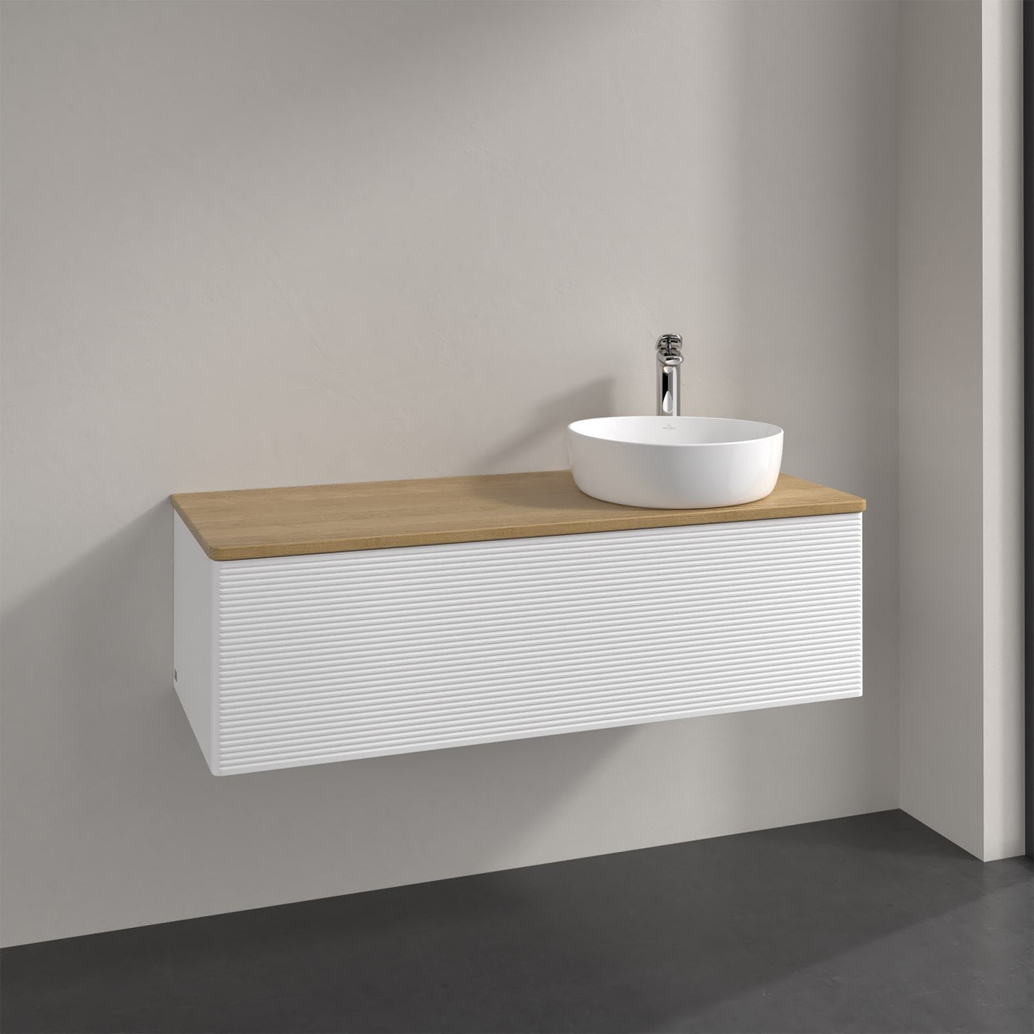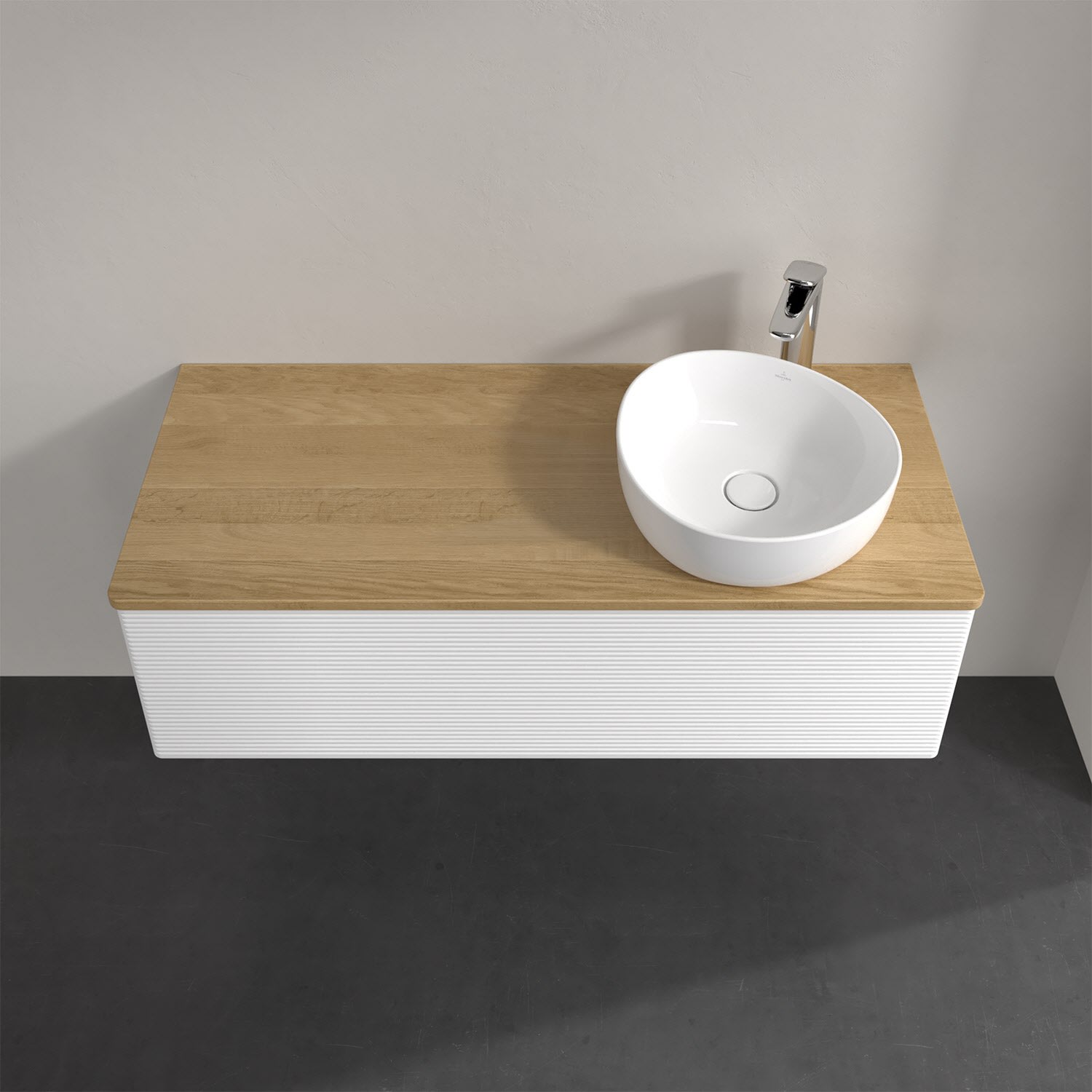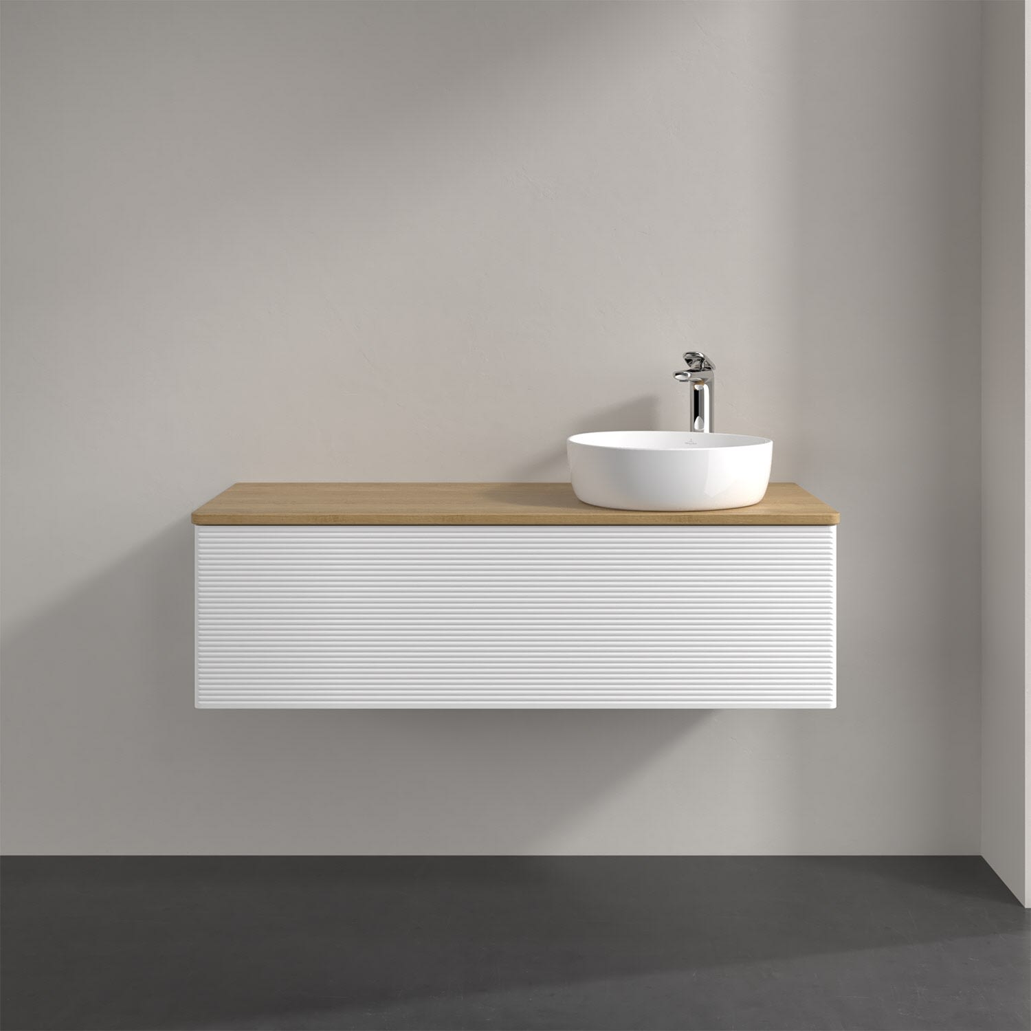 Villeroy & Boch Antao Waschbeckenunterschrank, 120 x 36 cm, 1 Auszug mit LED-Licht, Front mit Struktur, mit Hahnloch, für Waschtisch rechts