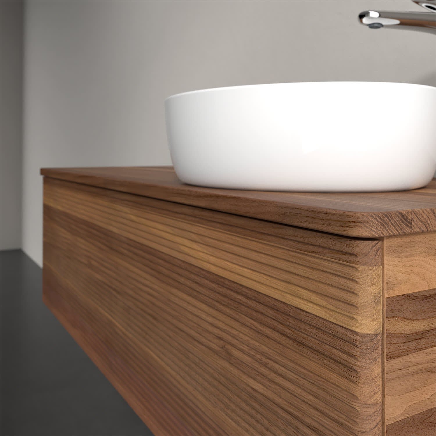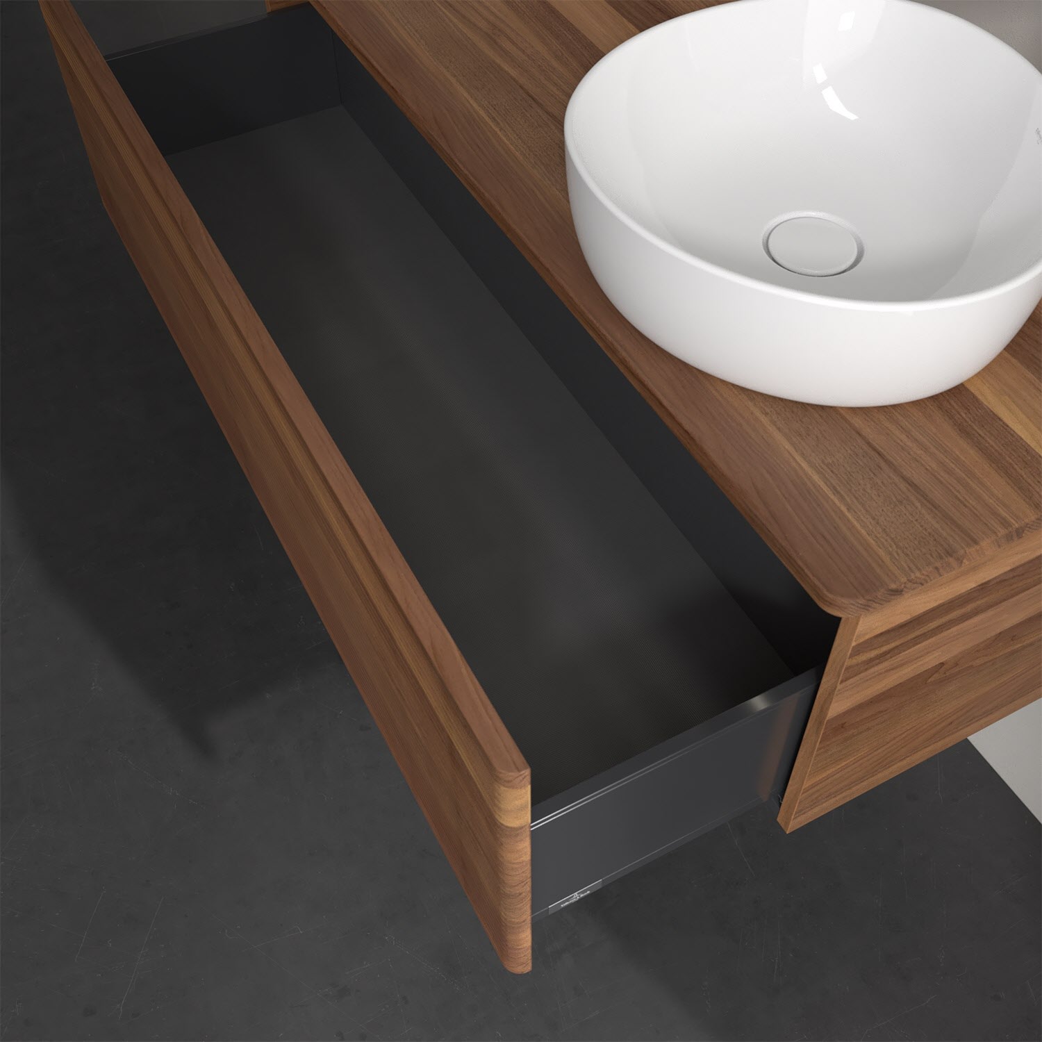 Der wandhängende Antao Waschtischunterschrank von Villeroy & Boch bietet nicht nur jede Menge Stauraum – er ist dank seines naturinspirierten Designs mit seinen abgerundeten Kanten auch noch besonders stilvoll und schafft eine gemütliche Atmosphäre im Badezimmer. Auf der Waschtischplatte bietet sich seitlich des Waschtischs viel Platz für Zahnbürstenbecher oder Seifenspender. Ein extra hoher Auszug bietet viel Platz, um alles Notwendige zu verstauen und Ordnung zu halten. Öffnen lässt er sich durch leichten Druck auf die strukturierte Front. Dabei aktiviert sich übrigens die Auszugsbeleuchtung in angenehmem Warmweiß. Dank Vollauszug hat man immer alles im Blick und der Antirutschboden verhindert ein Umfallen oder Verrutschen der Gegenstände. Einfach clever! Für eine besonders leichte Pflege sorgt die mehrschichtig deckend lackierte Oberfläche. Bei der Ausführung in Massivholz wird dank des verarbeiteten Massivholzes jedes Möbel zu einem Unikat, das sich durch das lebendige Naturmaterial durch seine einzigartige Struktur und Maserung auszeichnet.