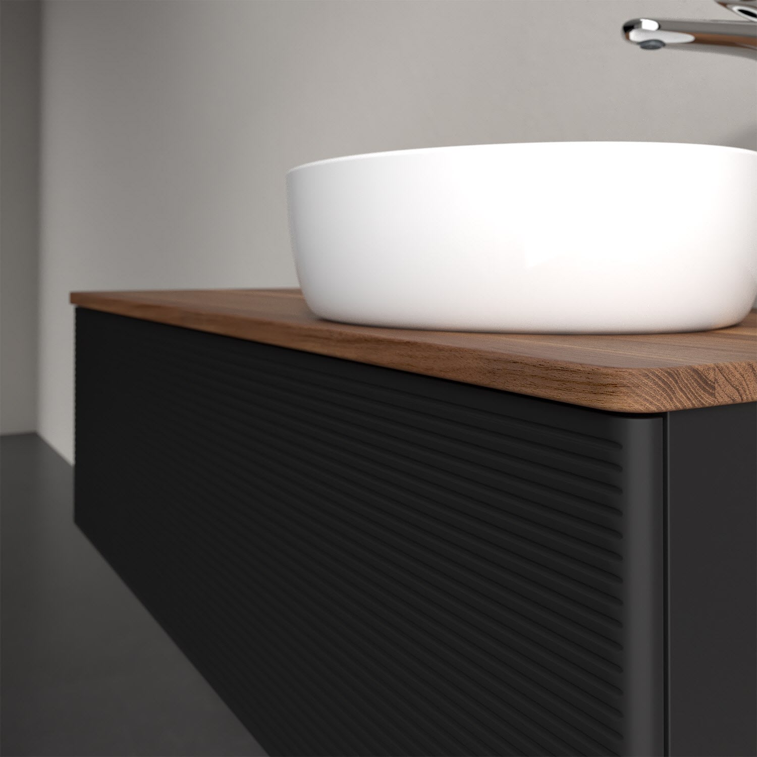 Der wandhängende Antao Waschtischunterschrank von Villeroy & Boch bietet nicht nur jede Menge Stauraum – er ist dank seines naturinspirierten Designs mit seinen abgerundeten Kanten auch noch besonders stilvoll und schafft eine gemütliche Atmosphäre im Badezimmer. Auf der Waschtischplatte bietet sich seitlich des Waschtischs viel Platz für Zahnbürstenbecher oder Seifenspender. Ein extra hoher Auszug bietet viel Platz, um alles Notwendige zu verstauen und Ordnung zu halten. Öffnen lässt er sich durch leichten Druck auf die strukturierte Front. Dabei aktiviert sich übrigens die Auszugsbeleuchtung in angenehmem Warmweiß. Dank Vollauszug hat man immer alles im Blick und der Antirutschboden verhindert ein Umfallen oder Verrutschen der Gegenstände. Einfach clever! Für eine besonders leichte Pflege sorgt die mehrschichtig deckend lackierte Oberfläche. Bei der Ausführung in Massivholz wird dank des verarbeiteten Massivholzes jedes Möbel zu einem Unikat, das sich durch das lebendige Naturmaterial durch seine einzigartige Struktur und Maserung auszeichnet.