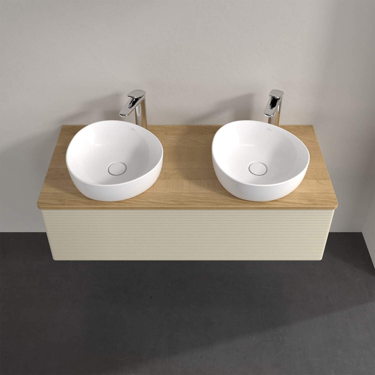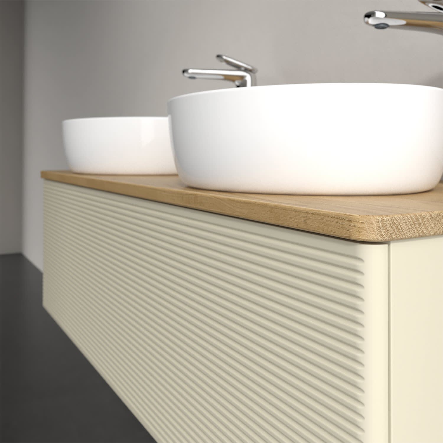Der wandhängende Antao Waschtischunterschrank von Villeroy & Boch bietet nicht nur jede Menge Stauraum – er ist dank seines naturinspirierten Designs mit seinen abgerundeten Kanten auch noch besonders stilvoll und schafft eine gemütliche Atmosphäre im Badezimmer. Kombiniert mit zwei passenden Aufsatzwaschtischen also die ideale Wahl. Ein extra hoher Auszug bietet viel Platz, um alles Notwendige zu verstauen und Ordnung zu halten. Öffnen lässt er sich durch leichten Druck auf die strukturierte Front. Dabei aktiviert sich übrigens die Auszugsbeleuchtung in angenehmem Warmweiß. Dank Vollauszug hat man immer alles im Blick und der Antirutschboden verhindert ein Umfallen oder Verrutschen der Gegenstände. Einfach clever! Für eine besonders leichte Pflege sorgt die mehrschichtig deckend lackierte Oberfläche. Bei der Ausführung in Massivholz wird dank des verarbeiteten Massivholzes jedes Möbel zu einem Unikat, das sich durch das lebendige Naturmaterial durch seine einzigartige Struktur und Maserung auszeichnet.