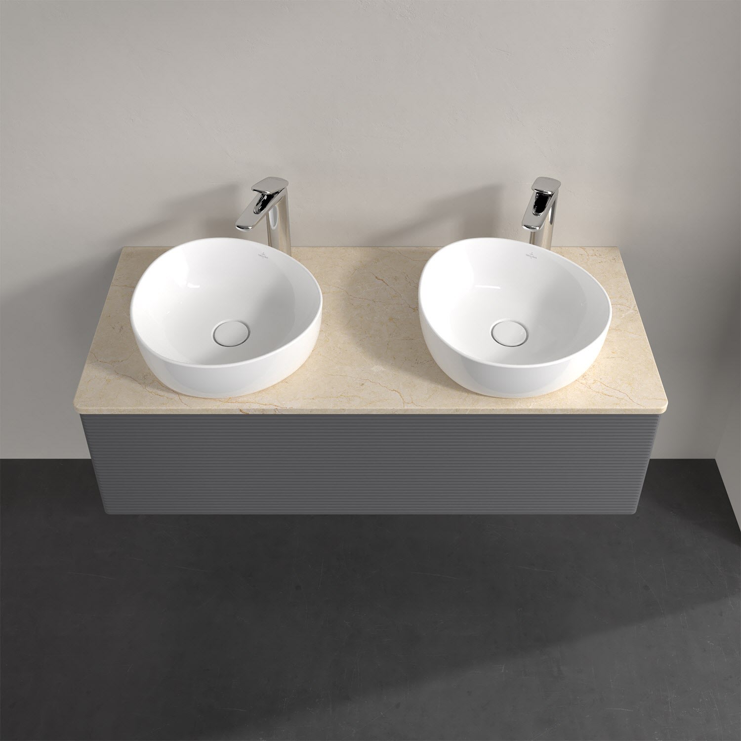 Der wandhängende Antao Waschtischunterschrank von Villeroy & Boch bietet nicht nur jede Menge Stauraum – er ist dank seines naturinspirierten Designs mit seinen abgerundeten Kanten auch noch besonders stilvoll und schafft eine gemütliche Atmosphäre im Badezimmer. Kombiniert mit zwei passenden Aufsatzwaschtischen also die ideale Wahl. Ein extra hoher Auszug bietet viel Platz, um alles Notwendige zu verstauen und Ordnung zu halten. Öffnen lässt er sich durch leichten Druck auf die strukturierte Front. Dabei aktiviert sich übrigens die Auszugsbeleuchtung in angenehmem Warmweiß. Dank Vollauszug hat man immer alles im Blick und der Antirutschboden verhindert ein Umfallen oder Verrutschen der Gegenstände. Einfach clever! Für eine besonders leichte Pflege sorgt die mehrschichtig deckend lackierte Oberfläche. Bei der Ausführung in Massivholz wird dank des verarbeiteten Massivholzes jedes Möbel zu einem Unikat, das sich durch das lebendige Naturmaterial durch seine einzigartige Struktur und Maserung auszeichnet.
