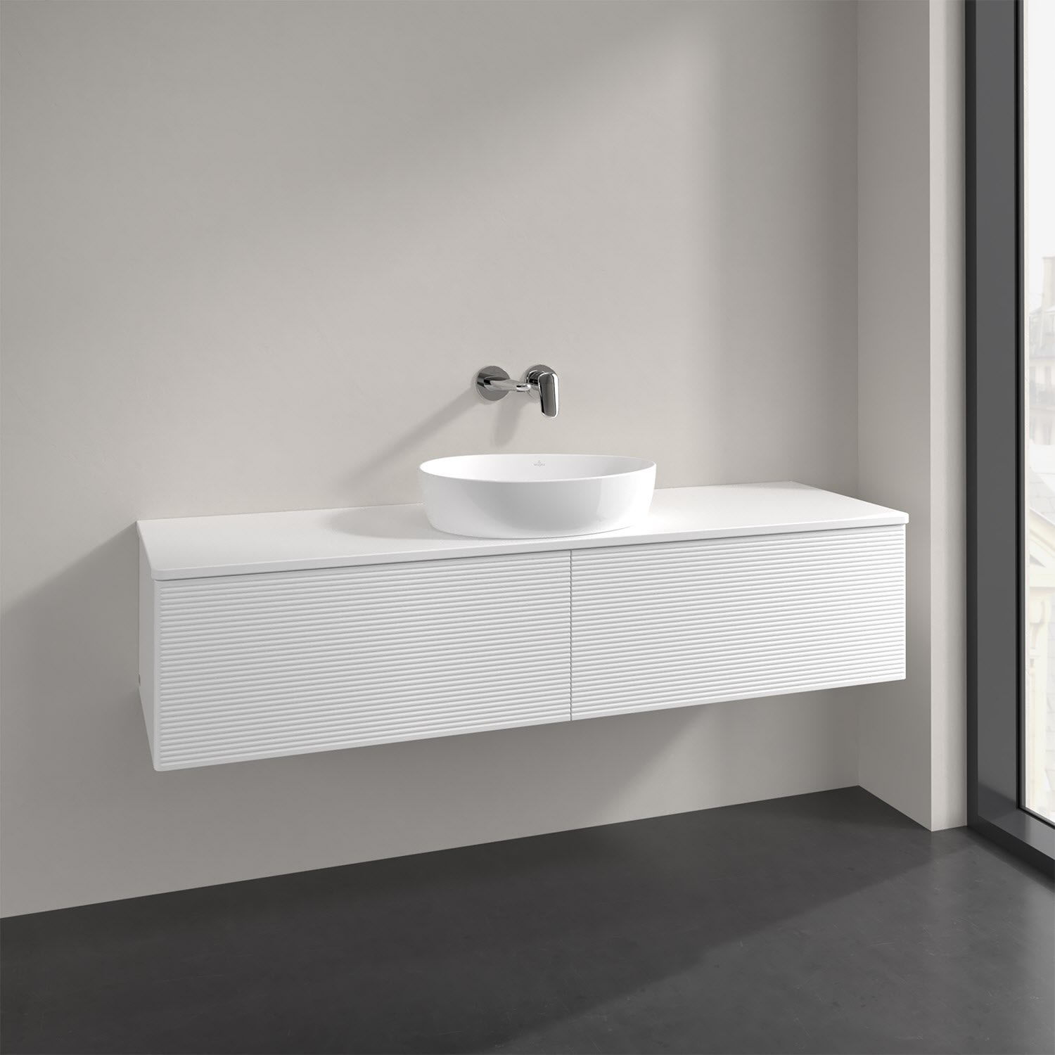 Villeroy & Boch Antao Waschbeckenunterschrank, 160 x 36 cm, 2 Auszüge mit LED-Licht, Front mit Struktur, mit Hahnloch, für Waschtisch mittig