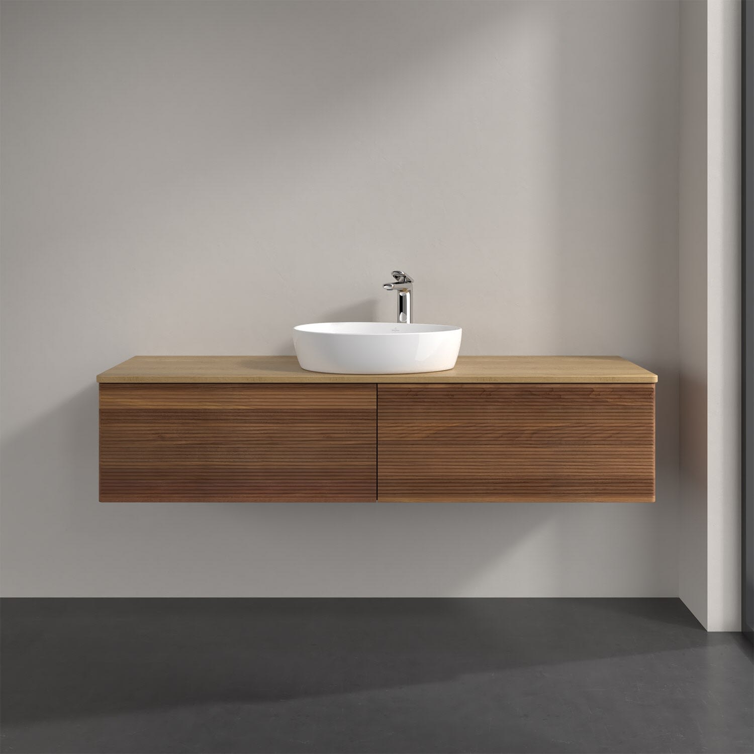 Villeroy & Boch Antao Waschbeckenunterschrank, 160 x 36 cm, 2 Auszüge mit LED-Licht, Front mit Struktur, mit Hahnloch, für Waschtisch mittig