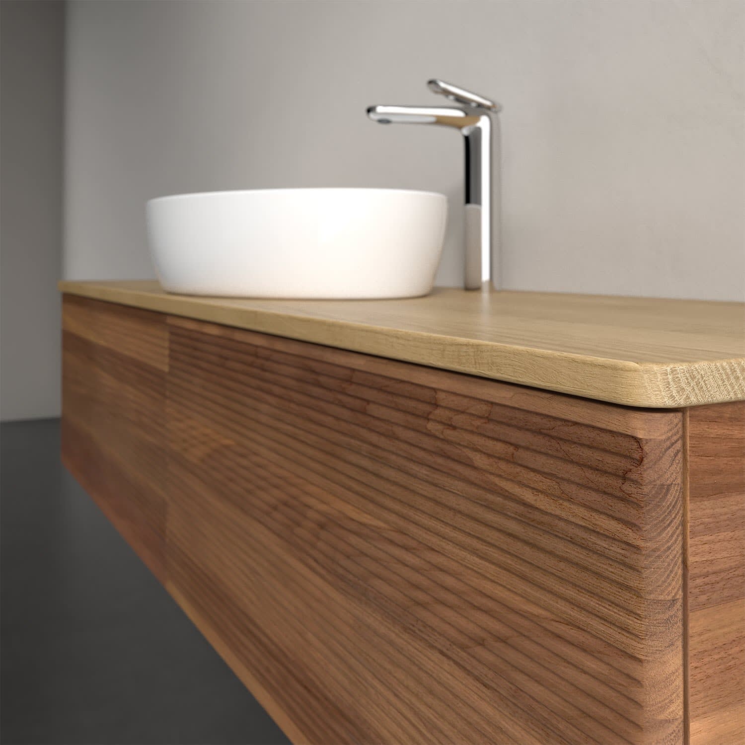 Der wandhängende Antao Waschtischunterschrank bietet mit seinen beiden extra hohen Auszügen und seiner erstaunlichen Größe viel Platz zum Verstauen von Utensilien im Badezimmer. Dank des mittig platzierten Aufsatzwaschtischs gibt es seitlich weiteren Platz für Handtücher, Seifenspender & Co. auf der Waschtischplatte. Inspiriert von der Natur überzeugt der Unterschrank auch optisch mit sanfter Formsprache und abgerundete Kanten. Die grifflosen Auszüge mit strukturierter Front sind mit der Push-to-Open Funktion ausgestattet und verfügen über einen Antirutschboden, damit Utensilien sicher verstaut werden können. Den Überblick behält man dank der warmweißen Auszugsbeleuchtung, die sich automatisch beim Öffnen einschaltet. Mit seiner Vollauszug- und Selbsteinzug-Funktion ist der Schrank einfach praktisch und leicht zu bedienen. Qualität von Villeroy & Boch! Für eine besonders leichte Pflege sorgt die mehrschichtig deckend lackierte Oberfläche. Bei der Ausführung in Massivholz wird dank des verarbeiteten Massivholzes jedes Möbel zu einem Unikat, das sich durch das lebendige Naturmaterial durch seine einzigartige Struktur und Maserung auszeichnet.