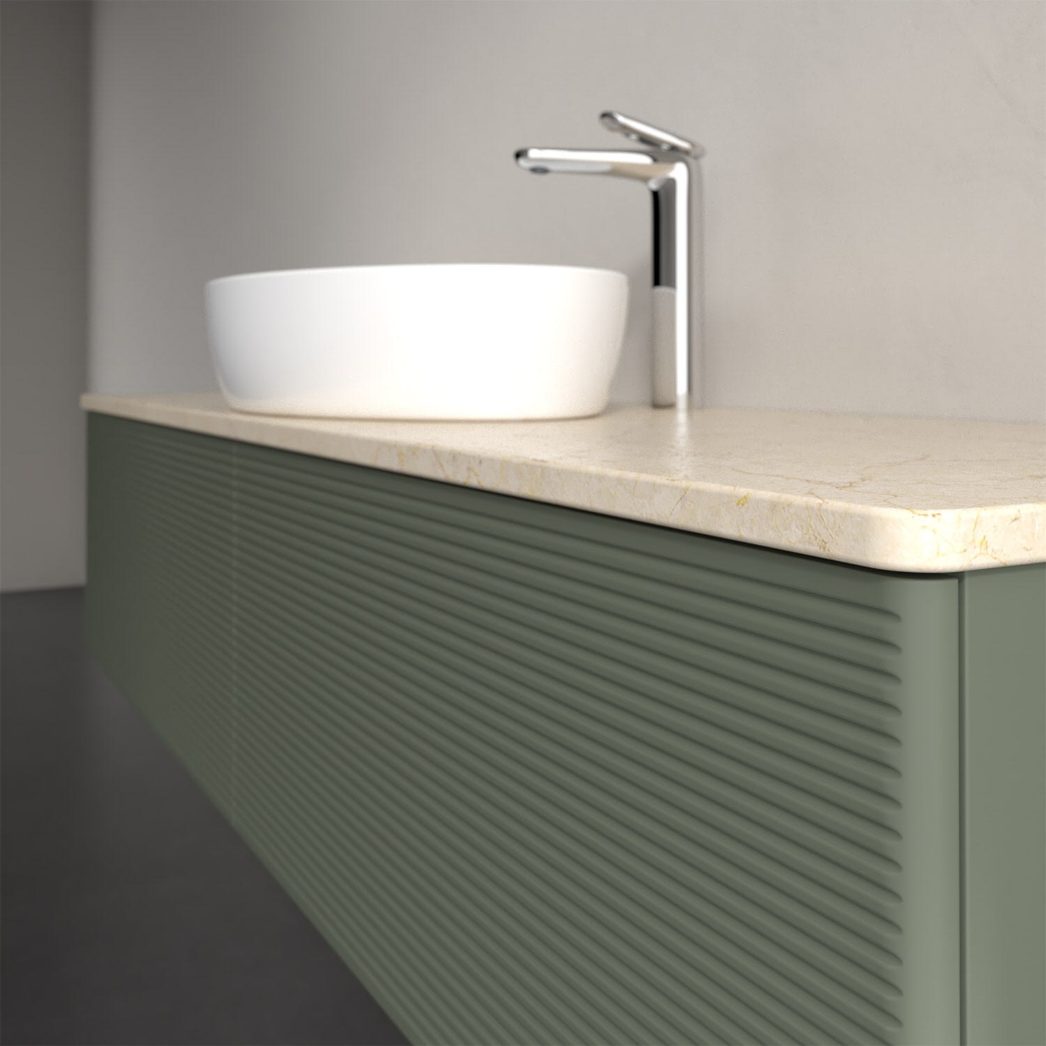Der wandhängende Antao Waschtischunterschrank bietet mit seinen beiden extra hohen Auszügen und seiner erstaunlichen Größe viel Platz zum Verstauen von Utensilien im Badezimmer. Dank des mittig platzierten Aufsatzwaschtischs gibt es seitlich weiteren Platz für Handtücher, Seifenspender & Co. auf der Waschtischplatte. Inspiriert von der Natur überzeugt der Unterschrank auch optisch mit sanfter Formsprache und abgerundete Kanten. Die grifflosen Auszüge mit strukturierter Front sind mit der Push-to-Open Funktion ausgestattet und verfügen über einen Antirutschboden, damit Utensilien sicher verstaut werden können. Den Überblick behält man dank der warmweißen Auszugsbeleuchtung, die sich automatisch beim Öffnen einschaltet. Mit seiner Vollauszug- und Selbsteinzug-Funktion ist der Schrank einfach praktisch und leicht zu bedienen. Qualität von Villeroy & Boch! Für eine besonders leichte Pflege sorgt die mehrschichtig deckend lackierte Oberfläche. Bei der Ausführung in Massivholz wird dank des verarbeiteten Massivholzes jedes Möbel zu einem Unikat, das sich durch das lebendige Naturmaterial durch seine einzigartige Struktur und Maserung auszeichnet.