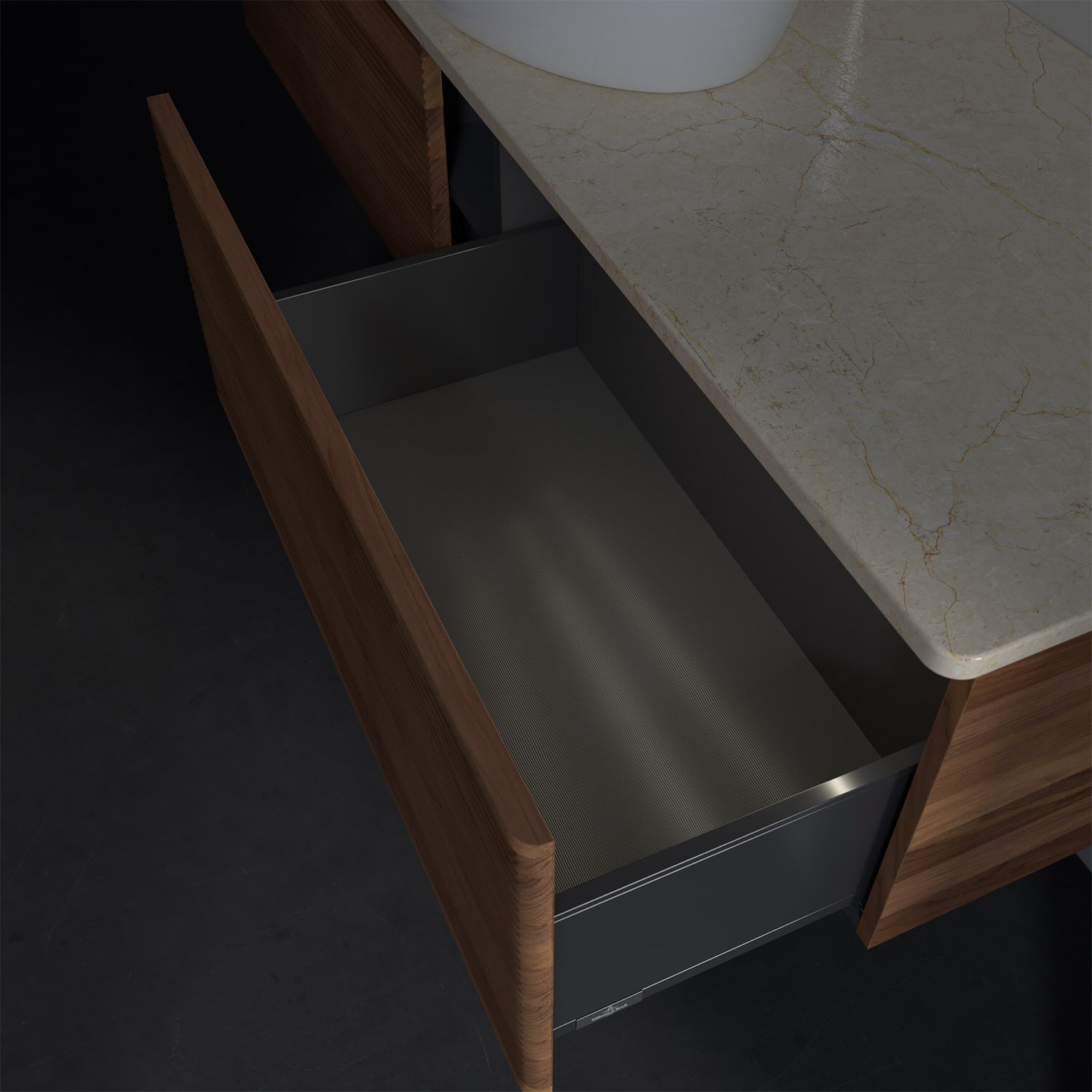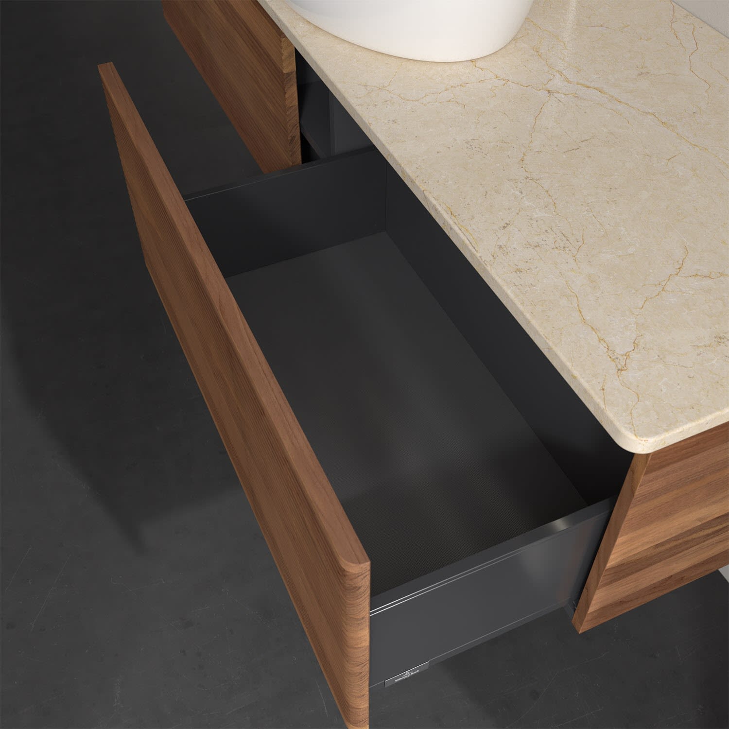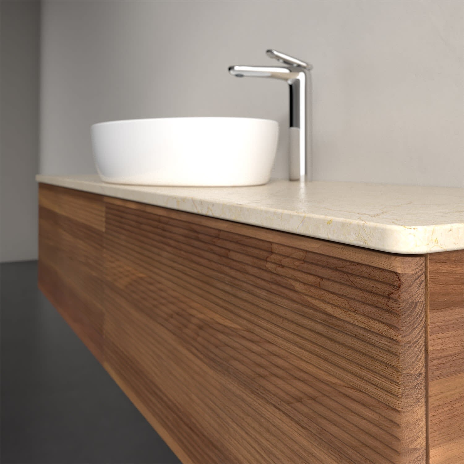 Der wandhängende Antao Waschtischunterschrank bietet mit seinen beiden extra hohen Auszügen und seiner erstaunlichen Größe viel Platz zum Verstauen von Utensilien im Badezimmer. Dank des mittig platzierten Aufsatzwaschtischs gibt es seitlich weiteren Platz für Handtücher, Seifenspender & Co. auf der Waschtischplatte. Inspiriert von der Natur überzeugt der Unterschrank auch optisch mit sanfter Formsprache und abgerundete Kanten. Die grifflosen Auszüge mit strukturierter Front sind mit der Push-to-Open Funktion ausgestattet und verfügen über einen Antirutschboden, damit Utensilien sicher verstaut werden können. Den Überblick behält man dank der warmweißen Auszugsbeleuchtung, die sich automatisch beim Öffnen einschaltet. Mit seiner Vollauszug- und Selbsteinzug-Funktion ist der Schrank einfach praktisch und leicht zu bedienen. Qualität von Villeroy & Boch! Für eine besonders leichte Pflege sorgt die mehrschichtig deckend lackierte Oberfläche. Bei der Ausführung in Massivholz wird dank des verarbeiteten Massivholzes jedes Möbel zu einem Unikat, das sich durch das lebendige Naturmaterial durch seine einzigartige Struktur und Maserung auszeichnet.