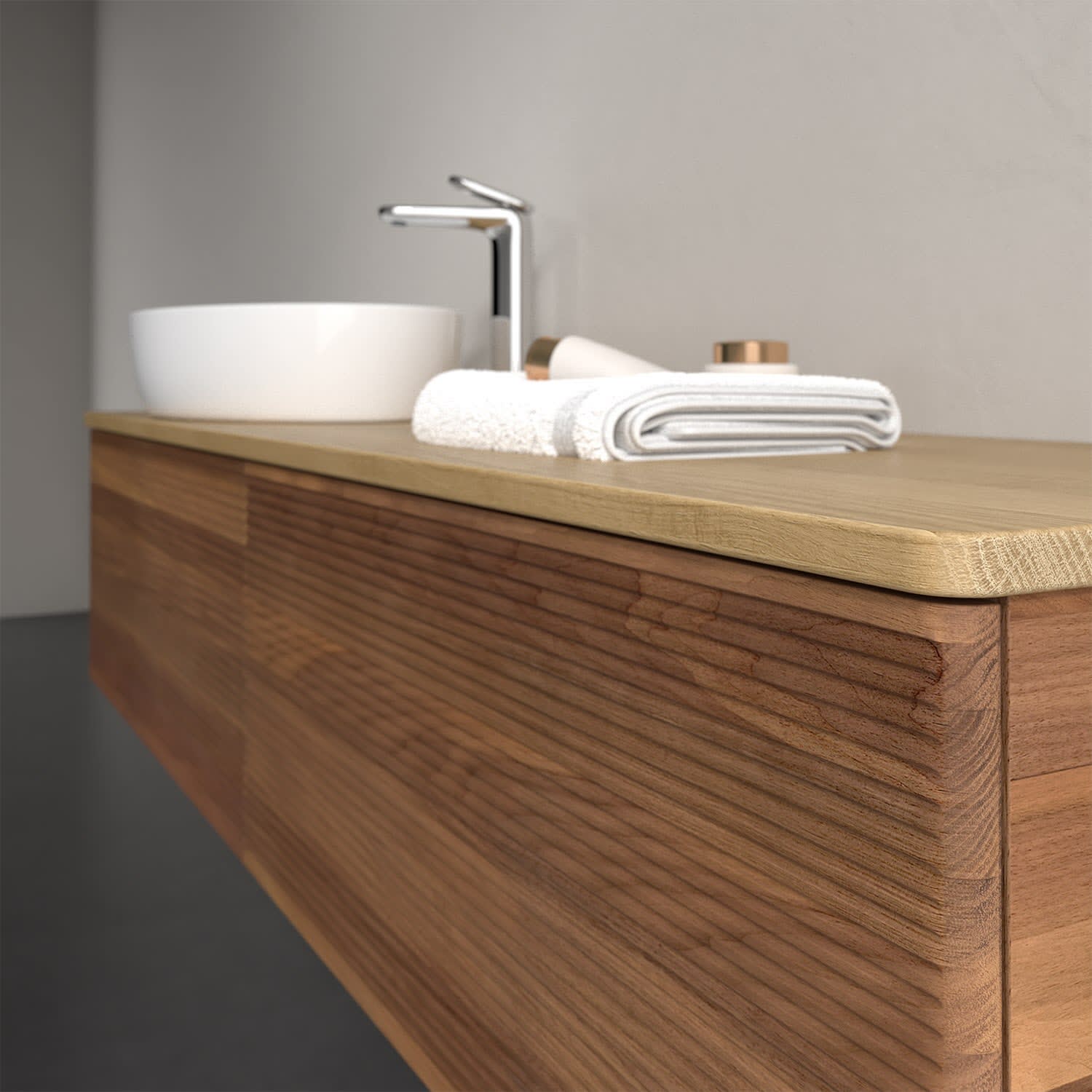 Der wandhängende Antao Waschtischunterschrank bietet mit seinen beiden extra hohen Auszügen und seiner erstaunlichen Größe viel Platz zum Verstauen von Utensilien im Badezimmer. Dank des seitlich platzierten Aufsatzwaschtischs gibt es daneben weiteren Platz für Handtücher, Seifenspender & Co. auf der Waschtischplatte. Inspiriert von der Natur überzeugt der Unterschrank auch optisch mit sanfter Formsprache und abgerundete Kanten. Die grifflosen Auszüge mit strukturierter Front sind mit der Push-to-Open Funktion ausgestattet und verfügen über einen Antirutschboden, damit Utensilien sicher verstaut werden können. Den Überblick behält man dank der warmweißen Auszugsbeleuchtung, die sich automatisch beim Öffnen einschaltet. Mit seiner Vollauszug- und Selbsteinzug-Funktion ist der Schrank einfach praktisch und leicht zu bedienen. Qualität von Villeroy & Boch! Für eine besonders leichte Pflege sorgt die mehrschichtig deckend lackierte Oberfläche. Bei der Ausführung in Massivholz wird dank des verarbeiteten Massivholzes jedes Möbel zu einem Unikat, das sich durch das lebendige Naturmaterial durch seine einzigartige Struktur und Maserung auszeichnet.
