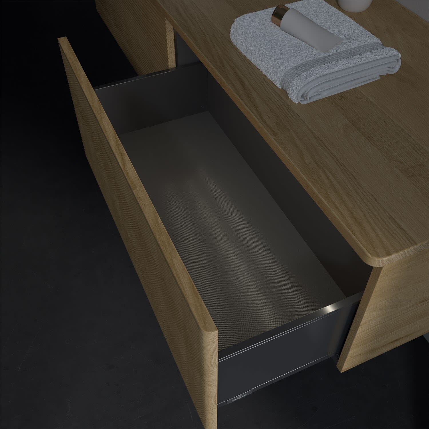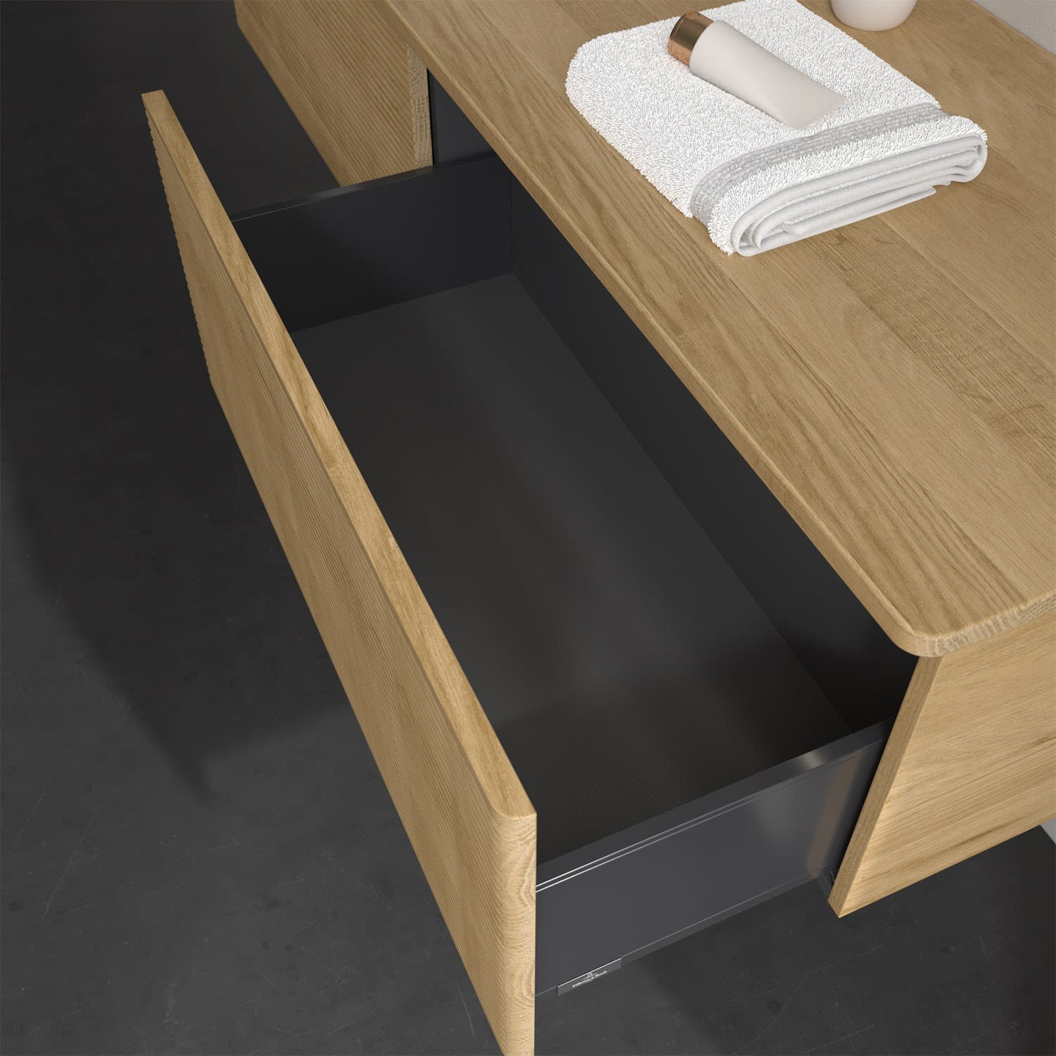- kein Umfallen oder Verrutschen von Pflegeprodukten in den Schubladen dank rutschhemmendem Boden