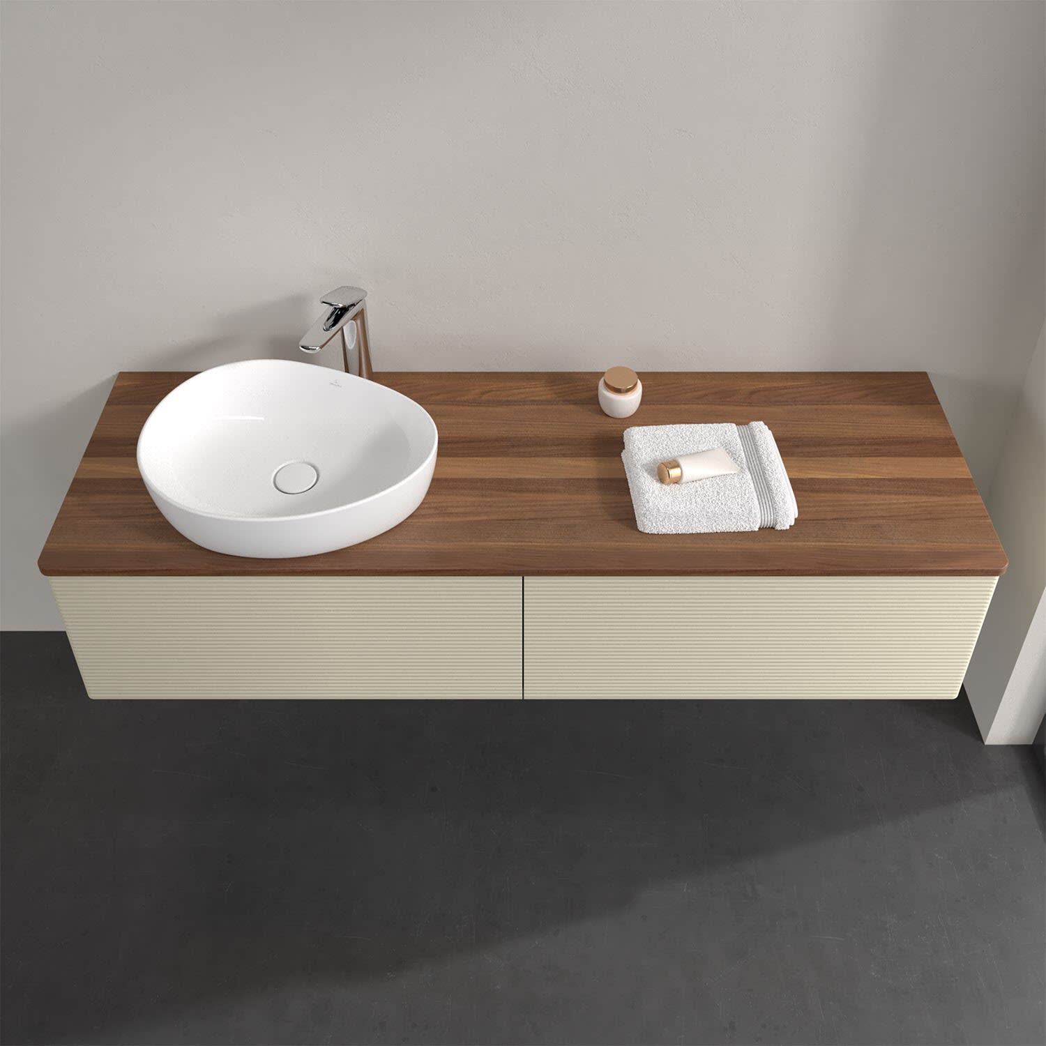 Für diesen Waschbeckenunterschrank stehen Ihnen Aufsatzwaschtische aus verschiedenen Serien zur Verfügung (siehe "Passliste" unter Downloads). Ein ausgewähltes Beispiel finden Sie im Zubehör. Den Waschtisch bitte separat mitbestellen.