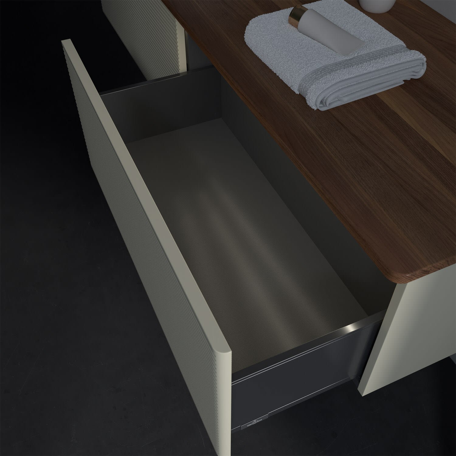 - kein Umfallen oder Verrutschen von Pflegeprodukten in den Schubladen dank rutschhemmendem Boden