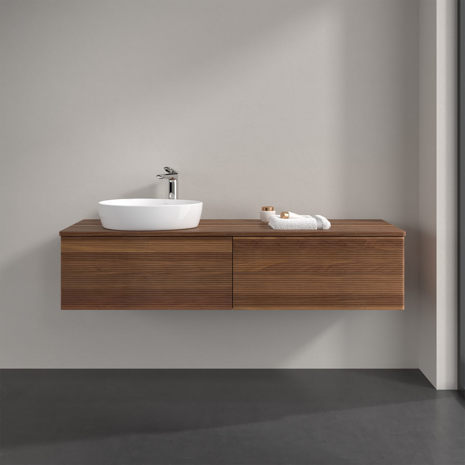 Villeroy & Boch Antao Waschbeckenunterschrank, 160 x 36 cm, 2 Auszüge mit LED-Licht, Front mit Struktur, mit Hahnloch, für Waschtisch links