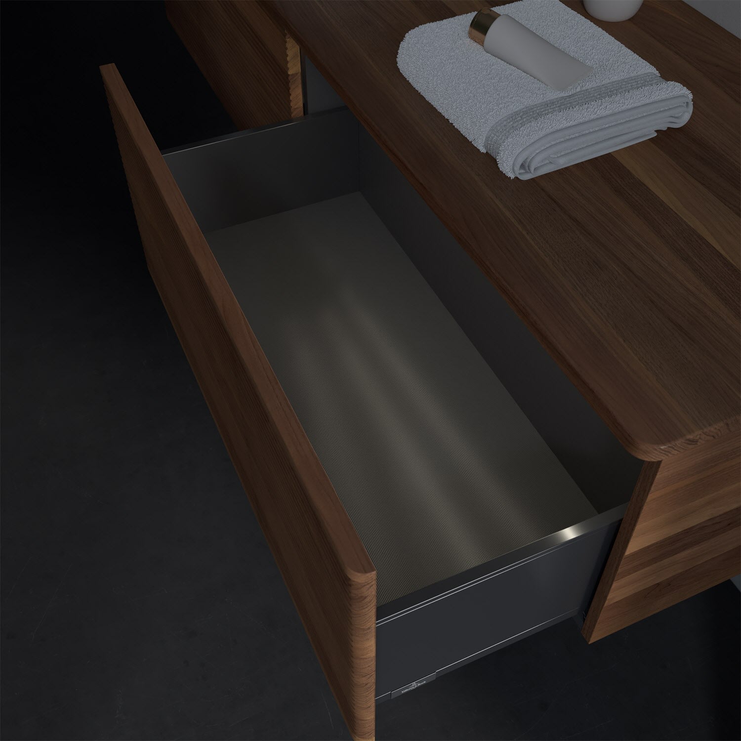 - kein Umfallen oder Verrutschen von Pflegeprodukten in den Schubladen dank rutschhemmendem Boden