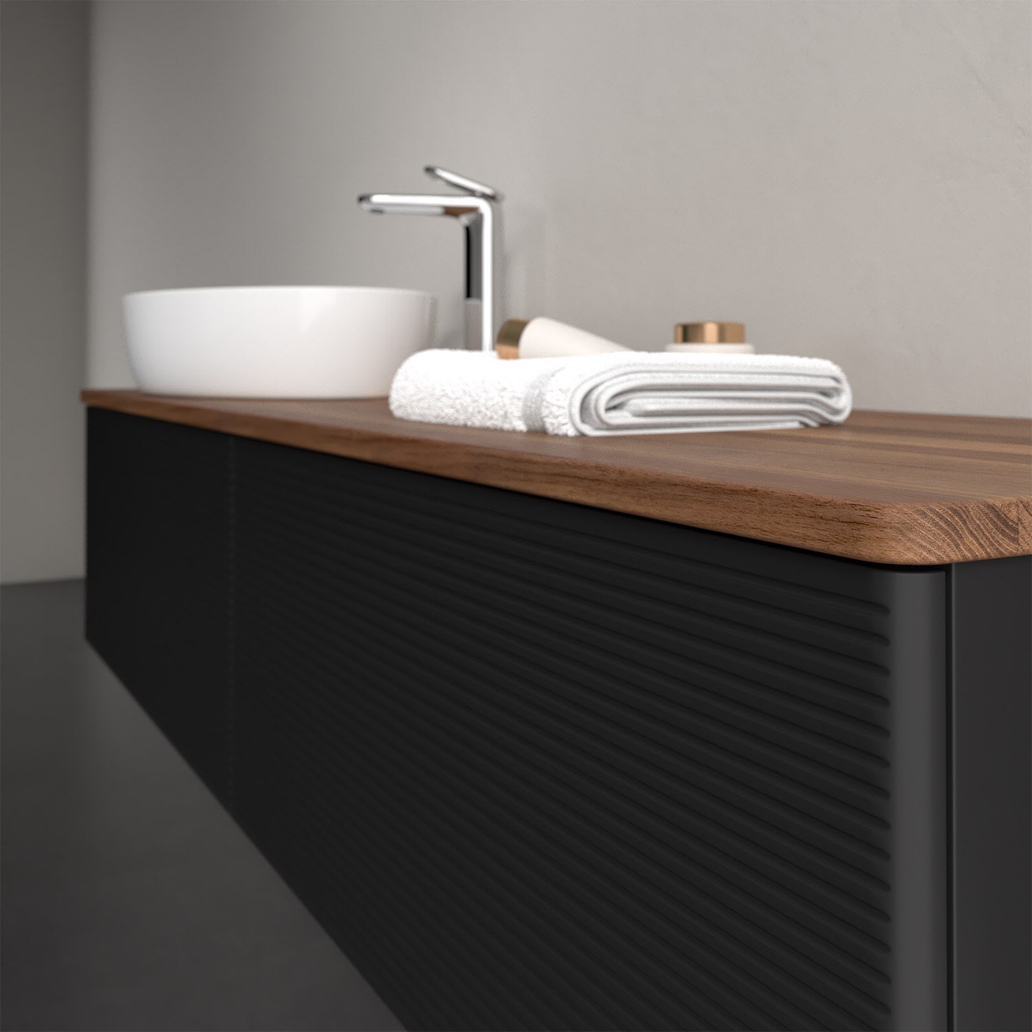 Der wandhängende Antao Waschtischunterschrank bietet mit seinen beiden extra hohen Auszügen und seiner erstaunlichen Größe viel Platz zum Verstauen von Utensilien im Badezimmer. Dank des seitlich platzierten Aufsatzwaschtischs gibt es daneben weiteren Platz für Handtücher, Seifenspender & Co. auf der Waschtischplatte. Inspiriert von der Natur überzeugt der Unterschrank auch optisch mit sanfter Formsprache und abgerundete Kanten. Die grifflosen Auszüge mit strukturierter Front sind mit der Push-to-Open Funktion ausgestattet und verfügen über einen Antirutschboden, damit Utensilien sicher verstaut werden können. Den Überblick behält man dank der warmweißen Auszugsbeleuchtung, die sich automatisch beim Öffnen einschaltet. Mit seiner Vollauszug- und Selbsteinzug-Funktion ist der Schrank einfach praktisch und leicht zu bedienen. Qualität von Villeroy & Boch! Für eine besonders leichte Pflege sorgt die mehrschichtig deckend lackierte Oberfläche. Bei der Ausführung in Massivholz wird dank des verarbeiteten Massivholzes jedes Möbel zu einem Unikat, das sich durch das lebendige Naturmaterial durch seine einzigartige Struktur und Maserung auszeichnet.