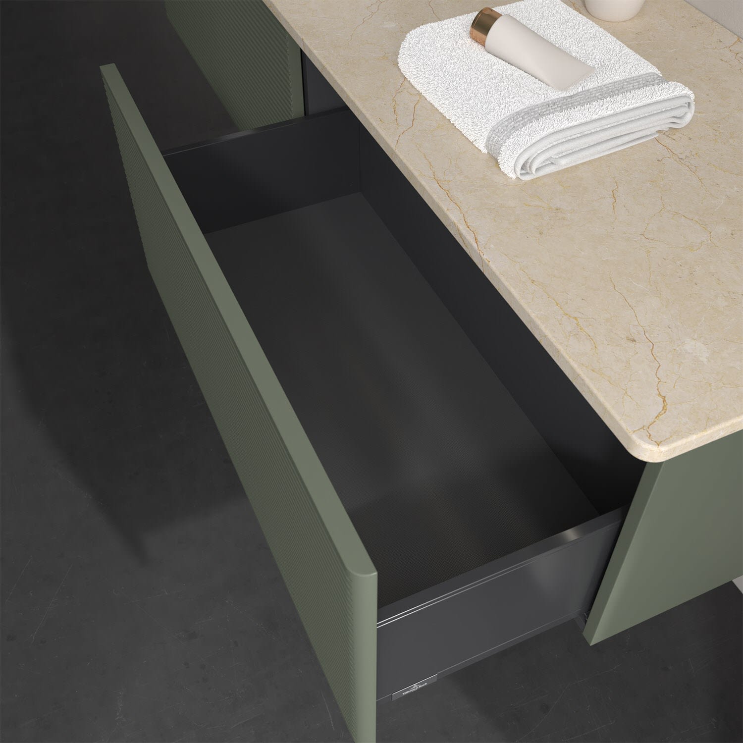 - kein Umfallen oder Verrutschen von Pflegeprodukten in den Schubladen dank rutschhemmendem Boden