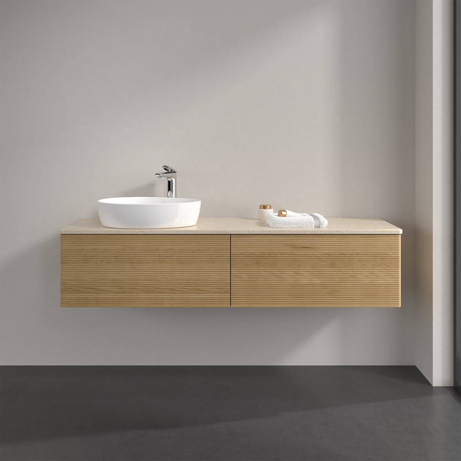 Villeroy & Boch Antao Waschbeckenunterschrank, 160 x 36 cm, 2 Auszüge mit LED-Licht, Front mit Struktur, mit Hahnloch, für Waschtisch links