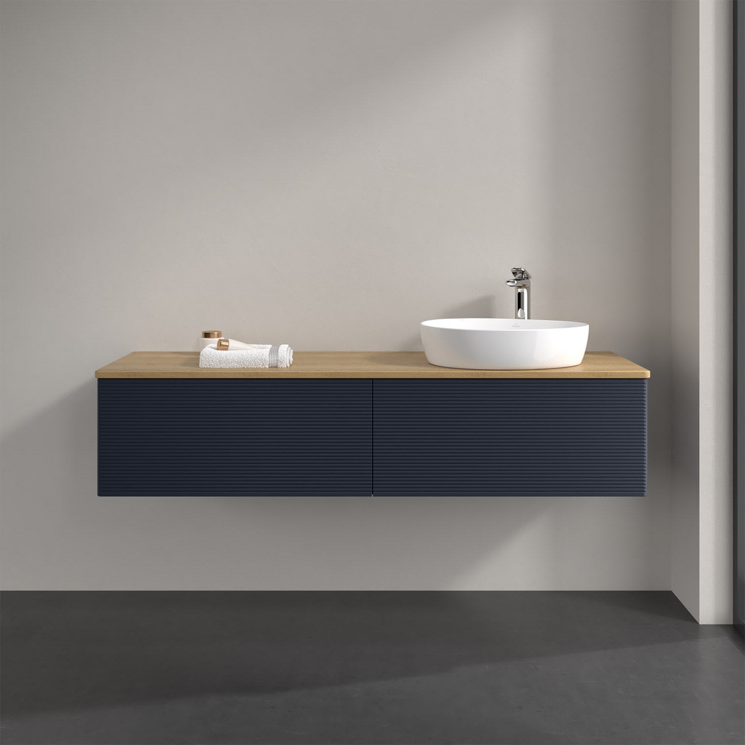Villeroy & Boch Antao Waschbeckenunterschrank, 160 x 36 cm, 2 Auszüge mit LED-Licht, Front mit Struktur, mit Hahnloch, für Waschtisch rechts