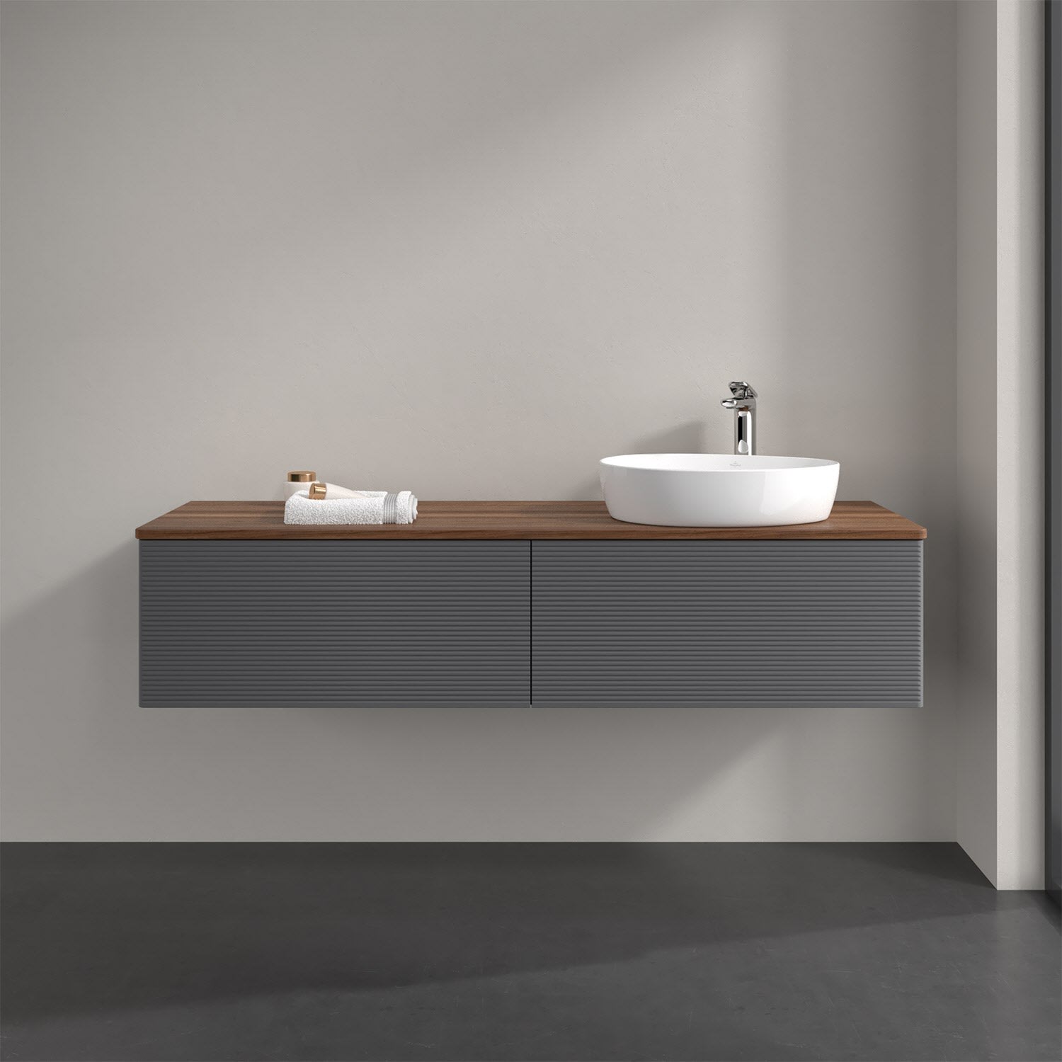 Villeroy & Boch Antao Waschbeckenunterschrank, 160 x 36 cm, 2 Auszüge mit LED-Licht, Front mit Struktur, mit Hahnloch, für Waschtisch rechts