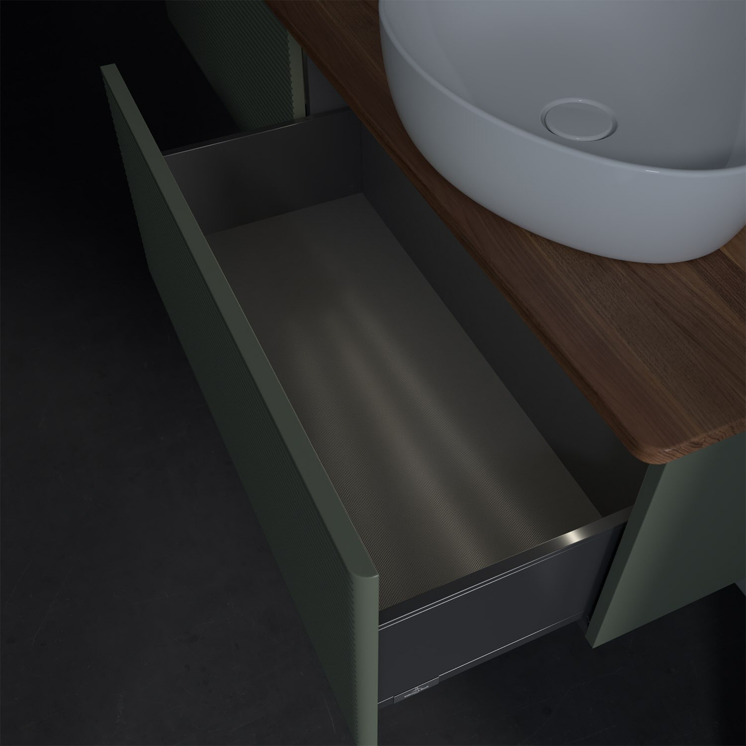 Der wandhängende Antao Waschtischunterschrank bietet mit seinen beiden extra hohen Auszügen und seiner erstaunlichen Größe viel Platz zum Verstauen von Utensilien im Badezimmer. Dank des seitlich platzierten Aufsatzwaschtischs gibt es daneben weiteren Platz für Handtücher, Seifenspender & Co. auf der Waschtischplatte. Inspiriert von der Natur überzeugt der Unterschrank auch optisch mit sanfter Formsprache und abgerundete Kanten. Die grifflosen Auszüge mit strukturierter Front sind mit der Push-to-Open Funktion ausgestattet und verfügen über einen Antirutschboden, damit Utensilien sicher verstaut werden können. Den Überblick behält man dank der warmweißen Auszugsbeleuchtung, die sich automatisch beim Öffnen einschaltet. Mit seiner Vollauszug- und Selbsteinzug-Funktion ist der Schrank einfach praktisch und leicht zu bedienen. Qualität von Villeroy & Boch! Für eine besonders leichte Pflege sorgt die mehrschichtig deckend lackierte Oberfläche. Bei der Ausführung in Massivholz wird dank des verarbeiteten Massivholzes jedes Möbel zu einem Unikat, das sich durch das lebendige Naturmaterial durch seine einzigartige Struktur und Maserung auszeichnet.