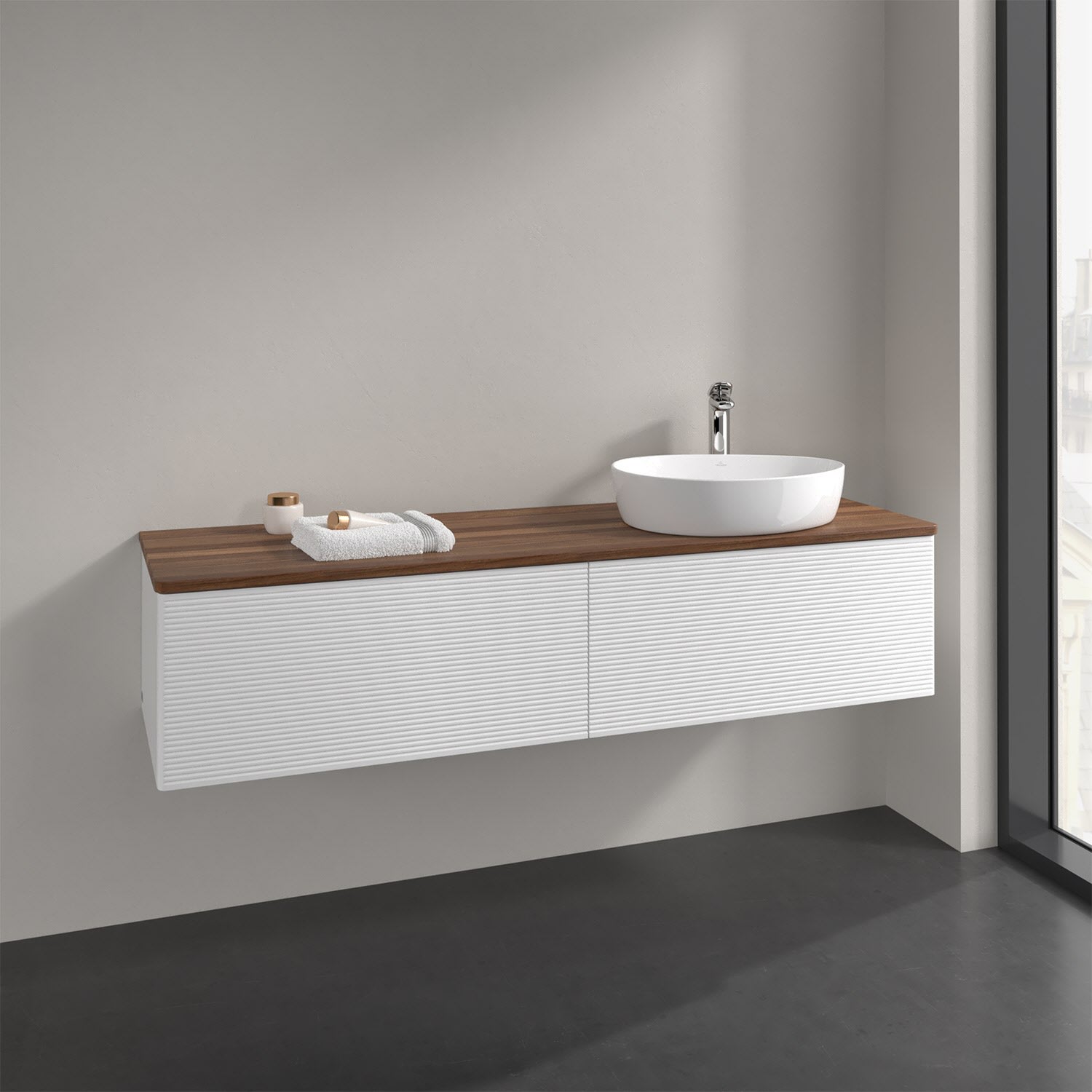 Villeroy & Boch Antao Waschbeckenunterschrank, 160 x 36 cm, 2 Auszüge mit LED-Licht, Front mit Struktur, mit Hahnloch, für Waschtisch rechts
