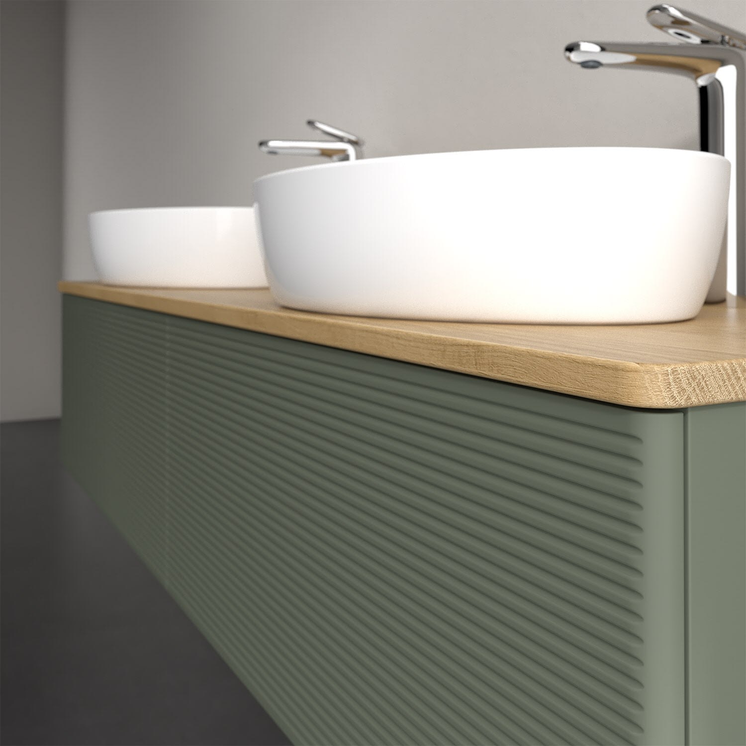 Der wandhängende Antao Waschtischunterschrank für zwei Aufsatzwaschtische bietet mit seinen beiden extra hohen Auszügen und seiner erstaunlichen Größe viel Platz zum Verstauen von Utensilien im Badezimmer. Inspiriert von der Natur überzeugt der Unterschrank auch optisch mit sanfter Formsprache und abgerundete Kanten. Die grifflosen Auszüge mit strukturierter Front sind mit der Push-to-Open Funktion ausgestattet und verfügen über einen Antirutschboden, damit Utensilien sicher verstaut werden können. Den Überblick behält man dank der warmweißen Auszugsbeleuchtung, die sich automatisch beim Öffnen einschaltet. Mit seiner Vollauszug- und Selbsteinzug-Funktion ist der Schrank einfach praktisch und leicht zu bedienen. Qualität von Villeroy & Boch! Für eine besonders leichte Pflege sorgt die mehrschichtig deckend lackierte Oberfläche. Bei der Ausführung in Massivholz wird dank des verarbeiteten Massivholzes jedes Möbel zu einem Unikat, das sich durch das lebendige Naturmaterial durch seine einzigartige Struktur und Maserung auszeichnet.