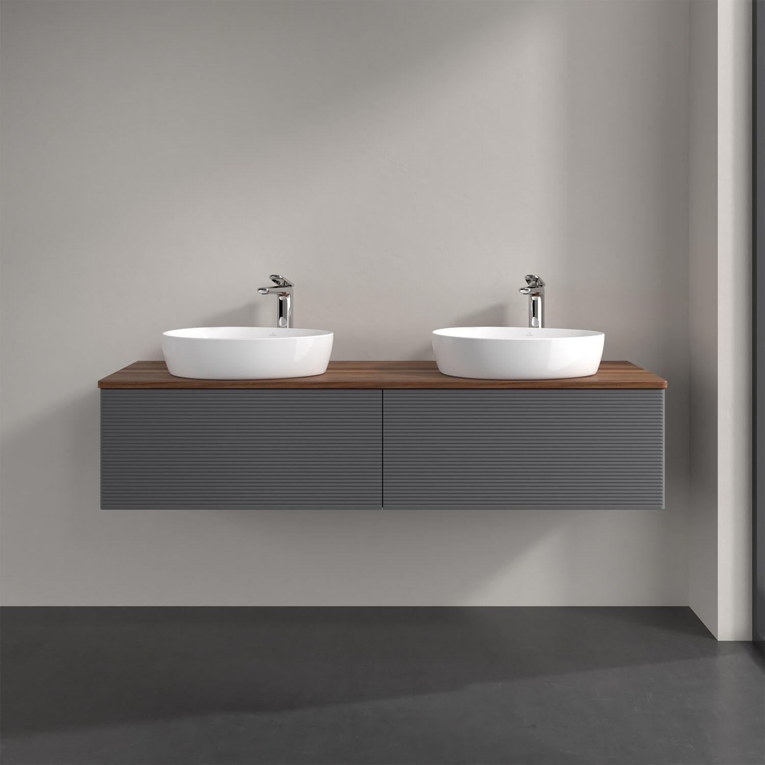 Villeroy & Boch Antao Waschbeckenunterschrank, 160 x 36 cm, 2 Auszüge mit LED-Licht, Front mit Struktur, mit Hahnloch, für Waschtisch links und rechts