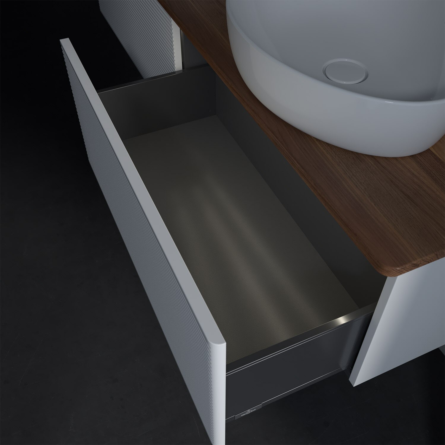 Der wandhängende Antao Waschtischunterschrank für zwei Aufsatzwaschtische bietet mit seinen beiden extra hohen Auszügen und seiner erstaunlichen Größe viel Platz zum Verstauen von Utensilien im Badezimmer. Inspiriert von der Natur überzeugt der Unterschrank auch optisch mit sanfter Formsprache und abgerundete Kanten. Die grifflosen Auszüge mit strukturierter Front sind mit der Push-to-Open Funktion ausgestattet und verfügen über einen Antirutschboden, damit Utensilien sicher verstaut werden können. Den Überblick behält man dank der warmweißen Auszugsbeleuchtung, die sich automatisch beim Öffnen einschaltet. Mit seiner Vollauszug- und Selbsteinzug-Funktion ist der Schrank einfach praktisch und leicht zu bedienen. Qualität von Villeroy & Boch! Für eine besonders leichte Pflege sorgt die mehrschichtig deckend lackierte Oberfläche. Bei der Ausführung in Massivholz wird dank des verarbeiteten Massivholzes jedes Möbel zu einem Unikat, das sich durch das lebendige Naturmaterial durch seine einzigartige Struktur und Maserung auszeichnet.