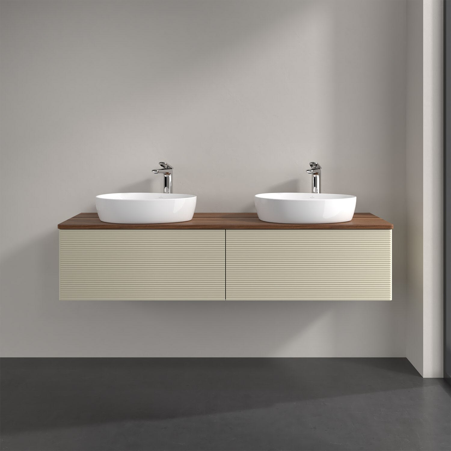 Der wandhängende Antao Waschtischunterschrank für zwei Aufsatzwaschtische bietet mit seinen beiden extra hohen Auszügen und seiner erstaunlichen Größe viel Platz zum Verstauen von Utensilien im Badezimmer. Inspiriert von der Natur überzeugt der Unterschrank auch optisch mit sanfter Formsprache und abgerundete Kanten. Die grifflosen Auszüge mit strukturierter Front sind mit der Push-to-Open Funktion ausgestattet und verfügen über einen Antirutschboden, damit Utensilien sicher verstaut werden können. Den Überblick behält man dank der warmweißen Auszugsbeleuchtung, die sich automatisch beim Öffnen einschaltet. Mit seiner Vollauszug- und Selbsteinzug-Funktion ist der Schrank einfach praktisch und leicht zu bedienen. Qualität von Villeroy & Boch! Für eine besonders leichte Pflege sorgt die mehrschichtig deckend lackierte Oberfläche. Bei der Ausführung in Massivholz wird dank des verarbeiteten Massivholzes jedes Möbel zu einem Unikat, das sich durch das lebendige Naturmaterial durch seine einzigartige Struktur und Maserung auszeichnet.