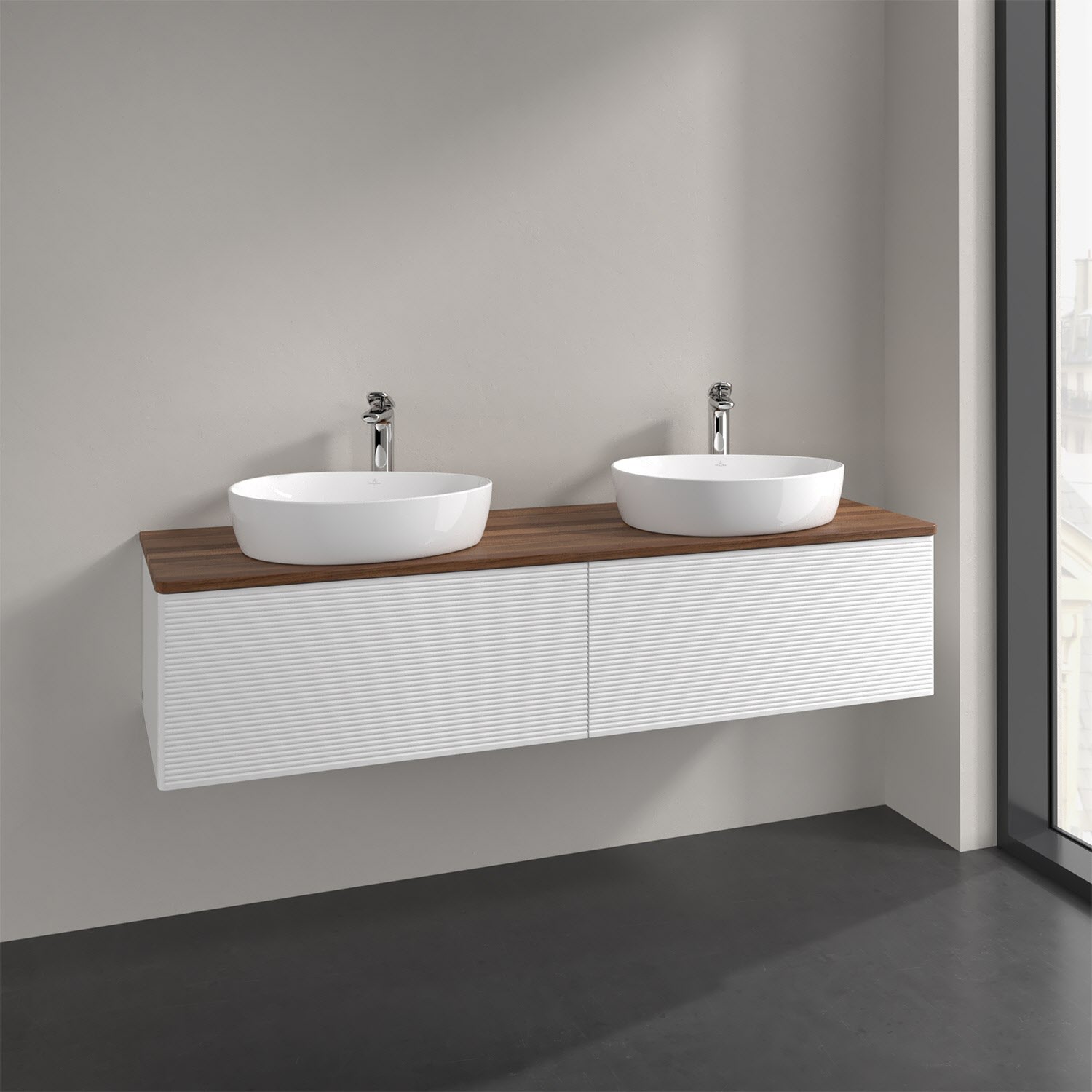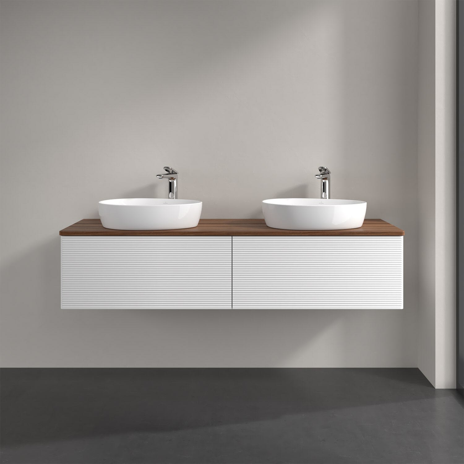 Der wandhängende Antao Waschtischunterschrank für zwei Aufsatzwaschtische bietet mit seinen beiden extra hohen Auszügen und seiner erstaunlichen Größe viel Platz zum Verstauen von Utensilien im Badezimmer. Inspiriert von der Natur überzeugt der Unterschrank auch optisch mit sanfter Formsprache und abgerundete Kanten. Die grifflosen Auszüge mit strukturierter Front sind mit der Push-to-Open Funktion ausgestattet und verfügen über einen Antirutschboden, damit Utensilien sicher verstaut werden können. Den Überblick behält man dank der warmweißen Auszugsbeleuchtung, die sich automatisch beim Öffnen einschaltet. Mit seiner Vollauszug- und Selbsteinzug-Funktion ist der Schrank einfach praktisch und leicht zu bedienen. Qualität von Villeroy & Boch! Für eine besonders leichte Pflege sorgt die mehrschichtig deckend lackierte Oberfläche. Bei der Ausführung in Massivholz wird dank des verarbeiteten Massivholzes jedes Möbel zu einem Unikat, das sich durch das lebendige Naturmaterial durch seine einzigartige Struktur und Maserung auszeichnet.