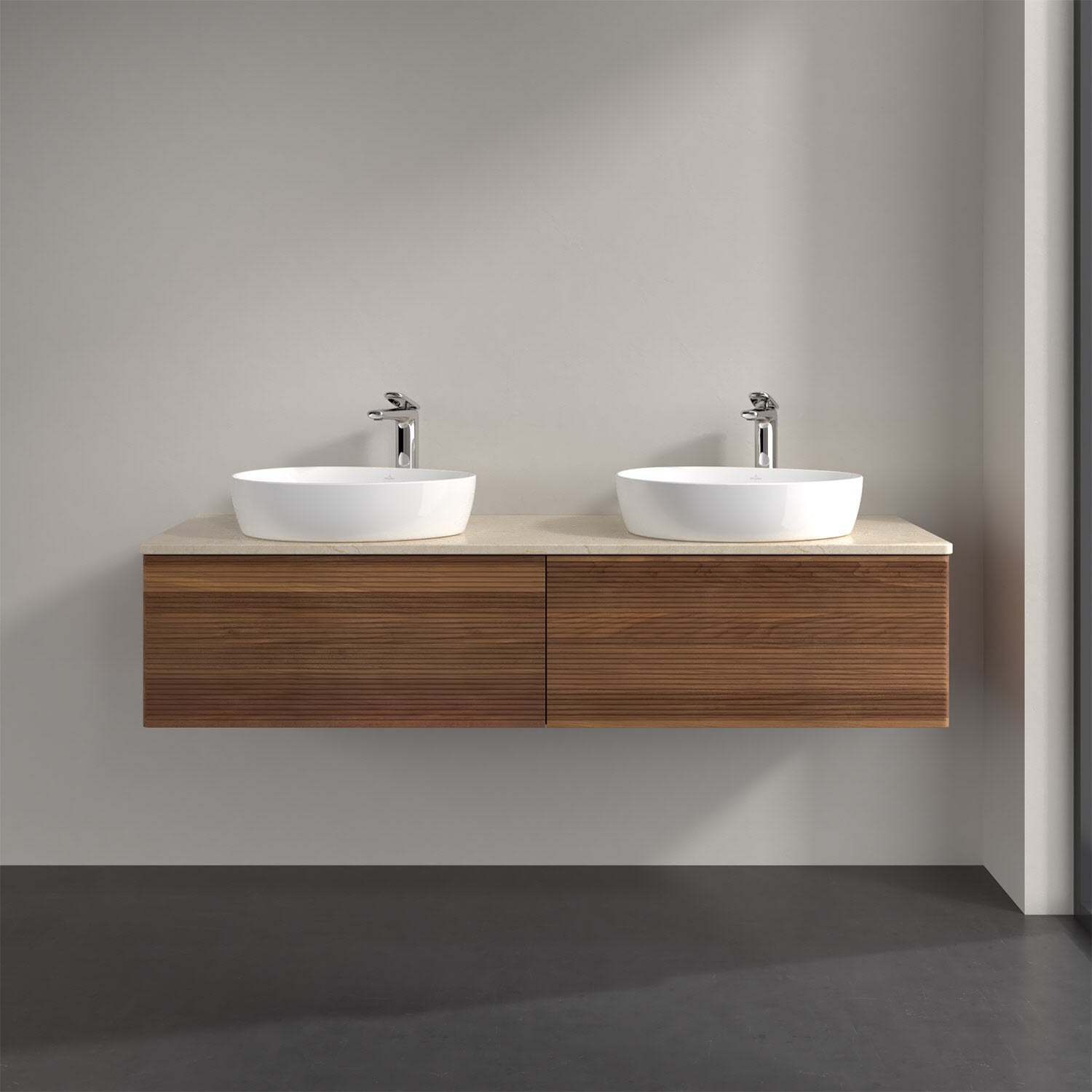 Villeroy & Boch Antao Waschbeckenunterschrank, 160 x 36 cm, 2 Auszüge mit LED-Licht, Front mit Struktur, mit Hahnloch, für Waschtisch links und rechts