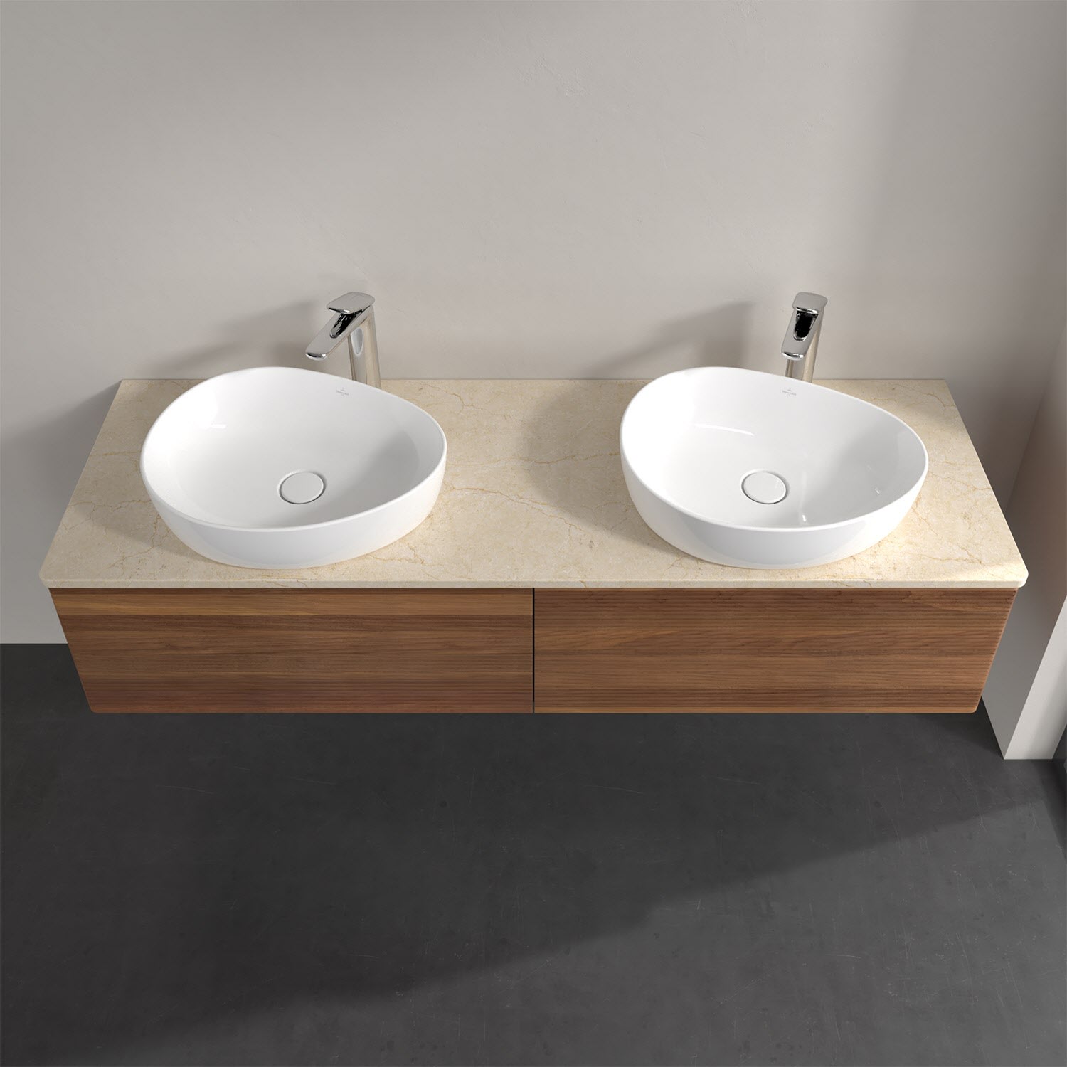 Für diesen Waschbeckenunterschrank stehen Ihnen Aufsatzwaschtische aus verschiedenen Serien zur Verfügung (siehe "Passliste" unter Downloads). Ein ausgewähltes Beispiel finden Sie im Zubehör. Den Waschtisch bitte separat mitbestellen.