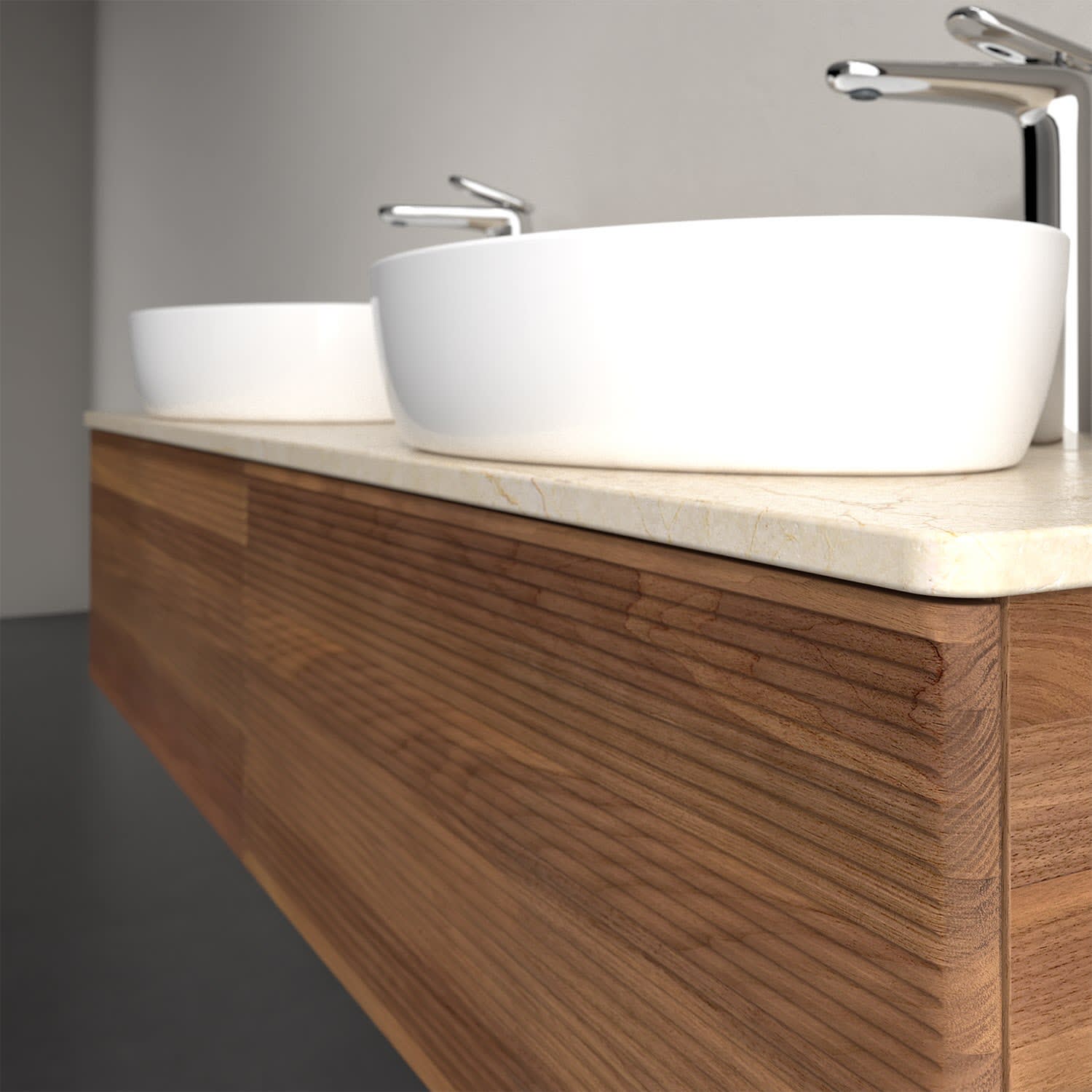 Der wandhängende Antao Waschtischunterschrank für zwei Aufsatzwaschtische bietet mit seinen beiden extra hohen Auszügen und seiner erstaunlichen Größe viel Platz zum Verstauen von Utensilien im Badezimmer. Inspiriert von der Natur überzeugt der Unterschrank auch optisch mit sanfter Formsprache und abgerundete Kanten. Die grifflosen Auszüge mit strukturierter Front sind mit der Push-to-Open Funktion ausgestattet und verfügen über einen Antirutschboden, damit Utensilien sicher verstaut werden können. Den Überblick behält man dank der warmweißen Auszugsbeleuchtung, die sich automatisch beim Öffnen einschaltet. Mit seiner Vollauszug- und Selbsteinzug-Funktion ist der Schrank einfach praktisch und leicht zu bedienen. Qualität von Villeroy & Boch! Für eine besonders leichte Pflege sorgt die mehrschichtig deckend lackierte Oberfläche. Bei der Ausführung in Massivholz wird dank des verarbeiteten Massivholzes jedes Möbel zu einem Unikat, das sich durch das lebendige Naturmaterial durch seine einzigartige Struktur und Maserung auszeichnet.
