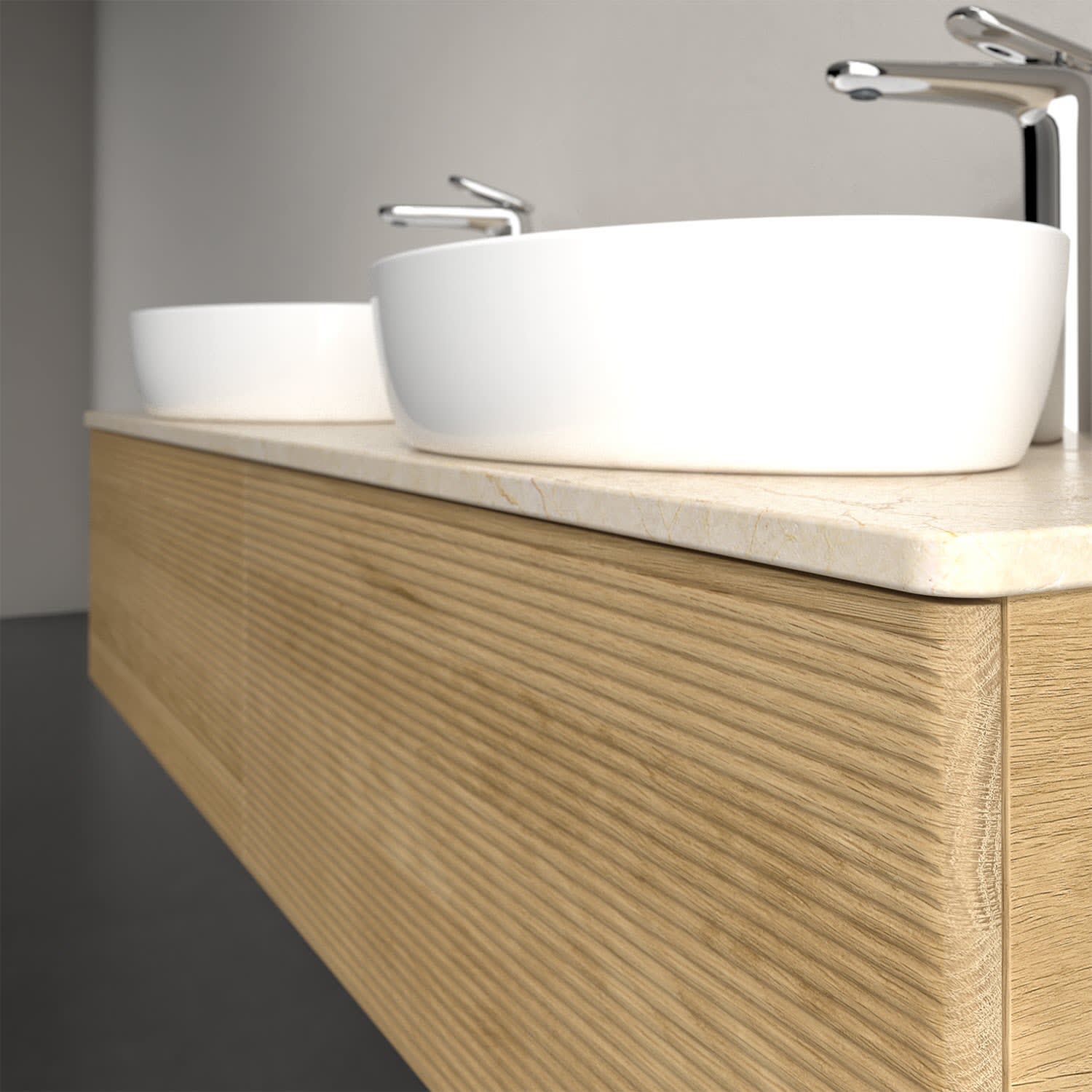 Der wandhängende Antao Waschtischunterschrank für zwei Aufsatzwaschtische bietet mit seinen beiden extra hohen Auszügen und seiner erstaunlichen Größe viel Platz zum Verstauen von Utensilien im Badezimmer. Inspiriert von der Natur überzeugt der Unterschrank auch optisch mit sanfter Formsprache und abgerundete Kanten. Die grifflosen Auszüge mit strukturierter Front sind mit der Push-to-Open Funktion ausgestattet und verfügen über einen Antirutschboden, damit Utensilien sicher verstaut werden können. Den Überblick behält man dank der warmweißen Auszugsbeleuchtung, die sich automatisch beim Öffnen einschaltet. Mit seiner Vollauszug- und Selbsteinzug-Funktion ist der Schrank einfach praktisch und leicht zu bedienen. Qualität von Villeroy & Boch! Für eine besonders leichte Pflege sorgt die mehrschichtig deckend lackierte Oberfläche. Bei der Ausführung in Massivholz wird dank des verarbeiteten Massivholzes jedes Möbel zu einem Unikat, das sich durch das lebendige Naturmaterial durch seine einzigartige Struktur und Maserung auszeichnet.