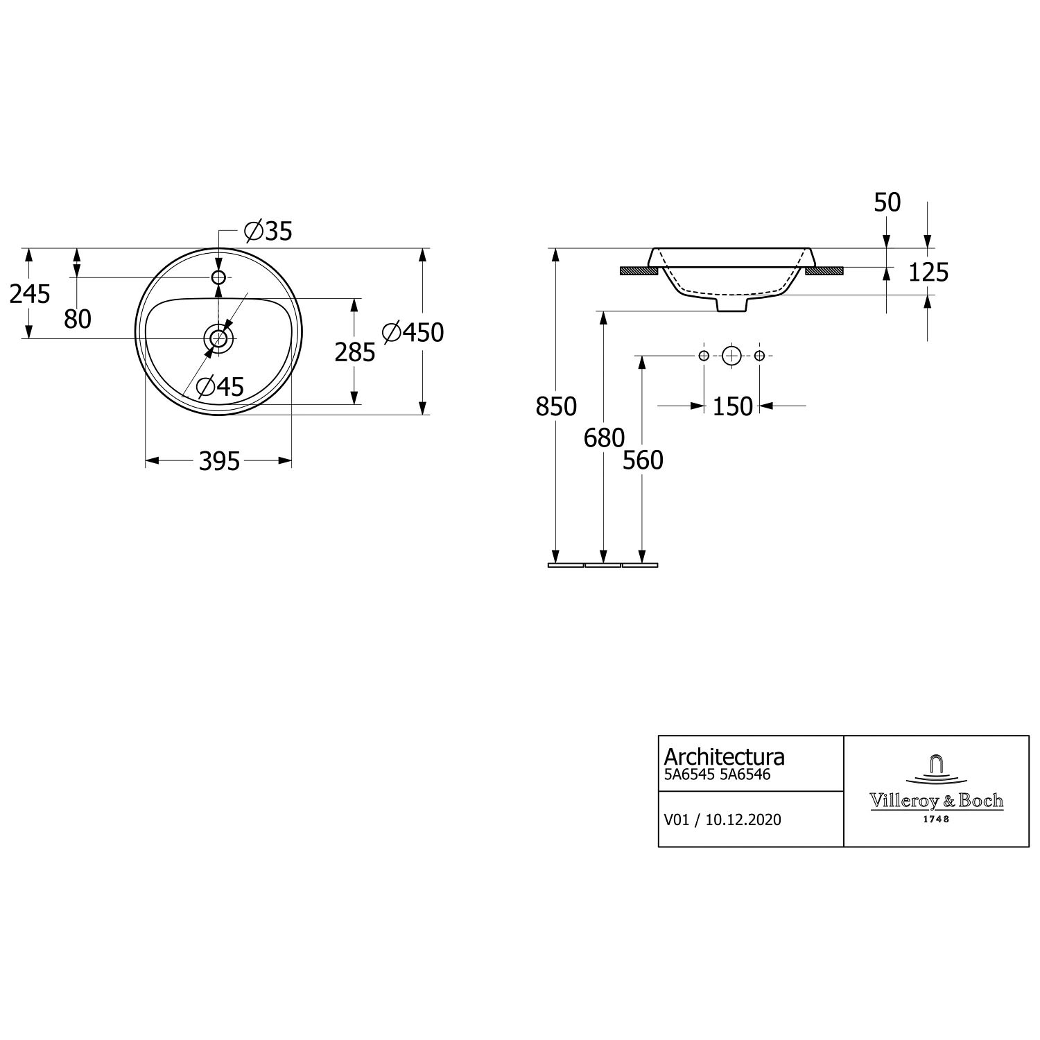 Villeroy & Boch Architectura Einbauwaschbecken 45 x 45 x 17 cm, rund, mit Überlauf, ungeschliffen
