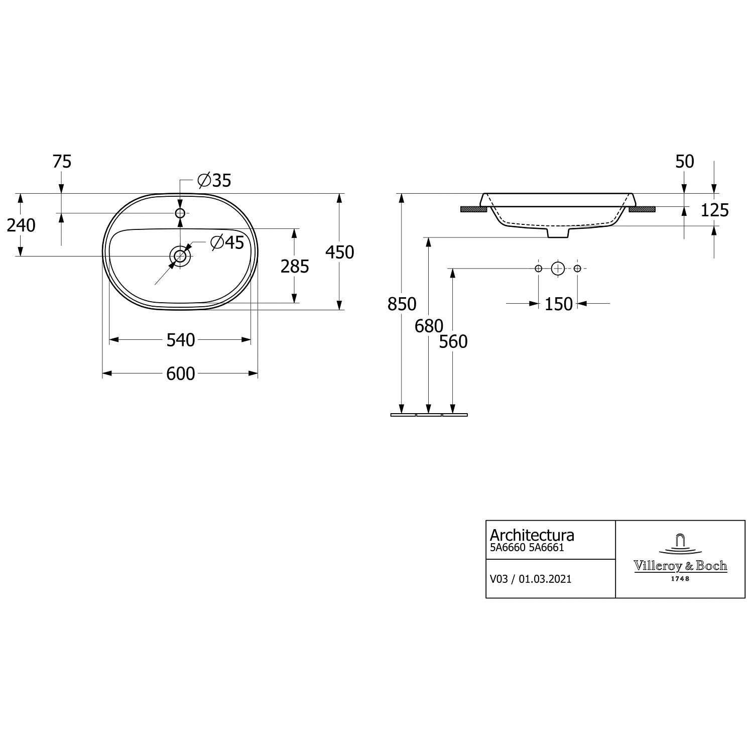Villeroy & Boch Architectura Einbauwaschbecken 60 x 45 x 17 cm, oval, ohne Überlauf, ungeschliffen