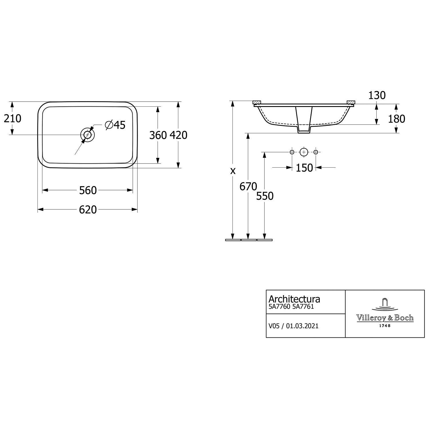 Villeroy & Boch Architectura Unterbauwaschbecken 62 x 42 cm rechteckig, ohne Überlauf, ungeschliffen