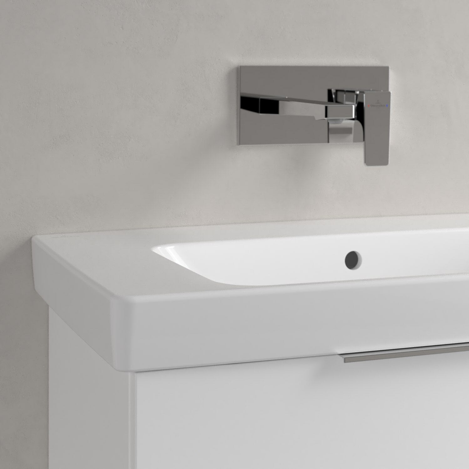 Ein zeitlos schönes Statement: Das rechteckige Waschbecken aus der Architectura Kollektion begeistert mit seinem klaren Design in jeder Hinsicht. Es lässt sich dank seiner minimalistischen Optik mühelos in verschiedene Badeinrichtungsstile integrieren. Auch funktional überzeugt das Waschbecken, denn auf seiner breiten Hahnlochbank finden Pflegeprodukte oder Zahnputzbecher Platz. Die beiden seitlichen Ablagen können für Bürste, Rasierer und Co. verwendet werden. Dank der Verarbeitung hochwertiger Sanitärkeramik von Villeroy & Boch ist nicht nur die Pflege kinderleicht, sondern auch eine langanhaltende Freude an diesem Produkt garantiert.
