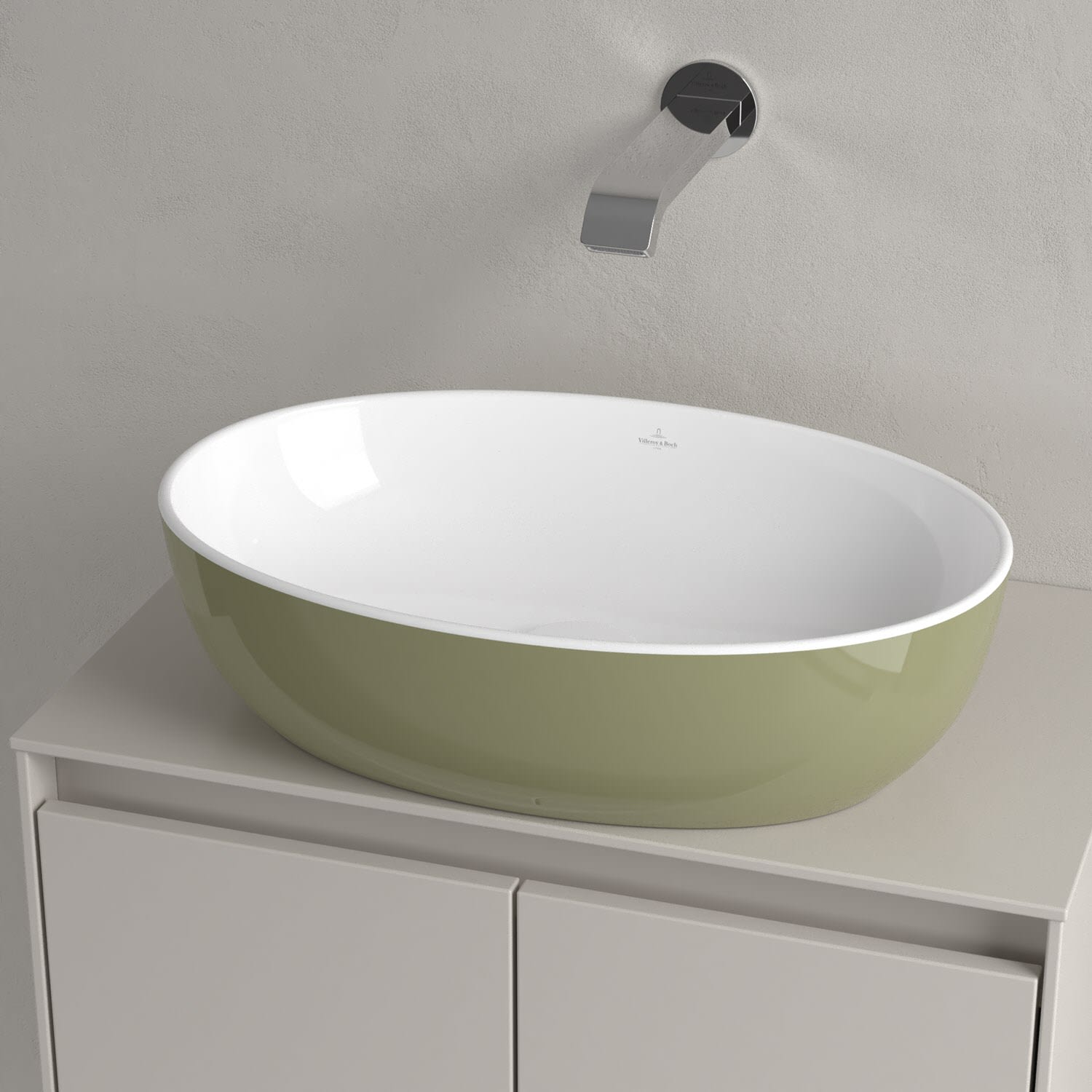 Ein Must Have für kleine Bäder und Gastbäder dank seiner kompakten Größe: der ovale Aufsatzwaschtisch der Kollektion Artis! Gefertigt aus dem innovativen Werkstoff TitanCeram besticht der Waschtisch durch schlichte Ästhetik und elegantes Design. Villeroy & Boch ermöglicht damit feine Konturen und eine besonders dünne Wandstärke, die dennoch mit außergewöhnlicher Robustheit und Stabilität überzeugt. Die großzügige Beckentiefe macht das Händewaschen äußerst komfortabel und schützt den umliegenden Bereich vor unerwünschten Wasserspritzern. Die moderne BiColour-Optik des Waschbeckens eignet sich perfekt, um designstarke Akzente im Badezimmer zu setzen. Dabei ist die Außenseite farbig gestaltet, während die Innenseite ganz klassisch Weiß gehalten ist. Entwickelt wurde das stilvolle Farbkonzept von der renommierten Designerin Gesa Hansen.