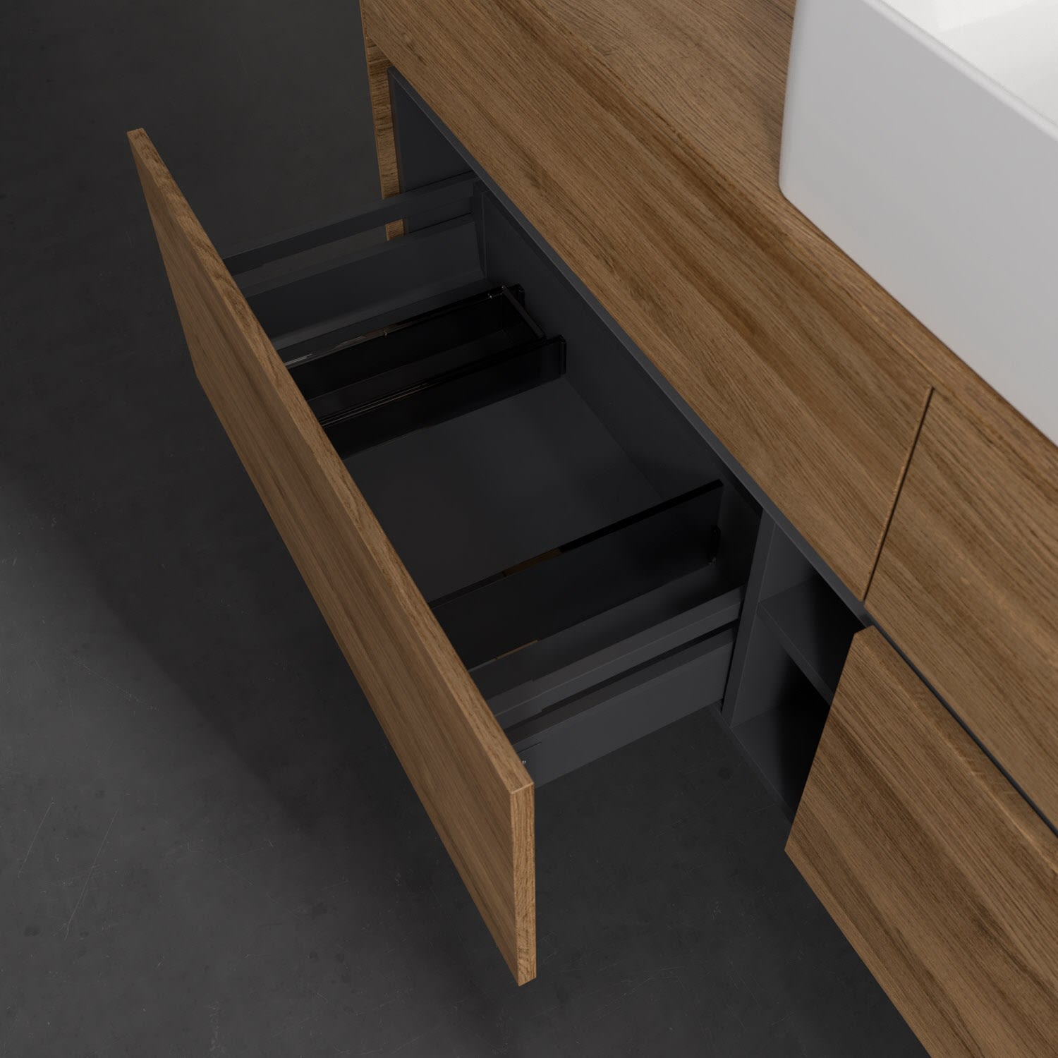- kein Umfallen oder Verrutschen von Pflegeprodukten in den Schubladen dank rutschhemmendem Boden