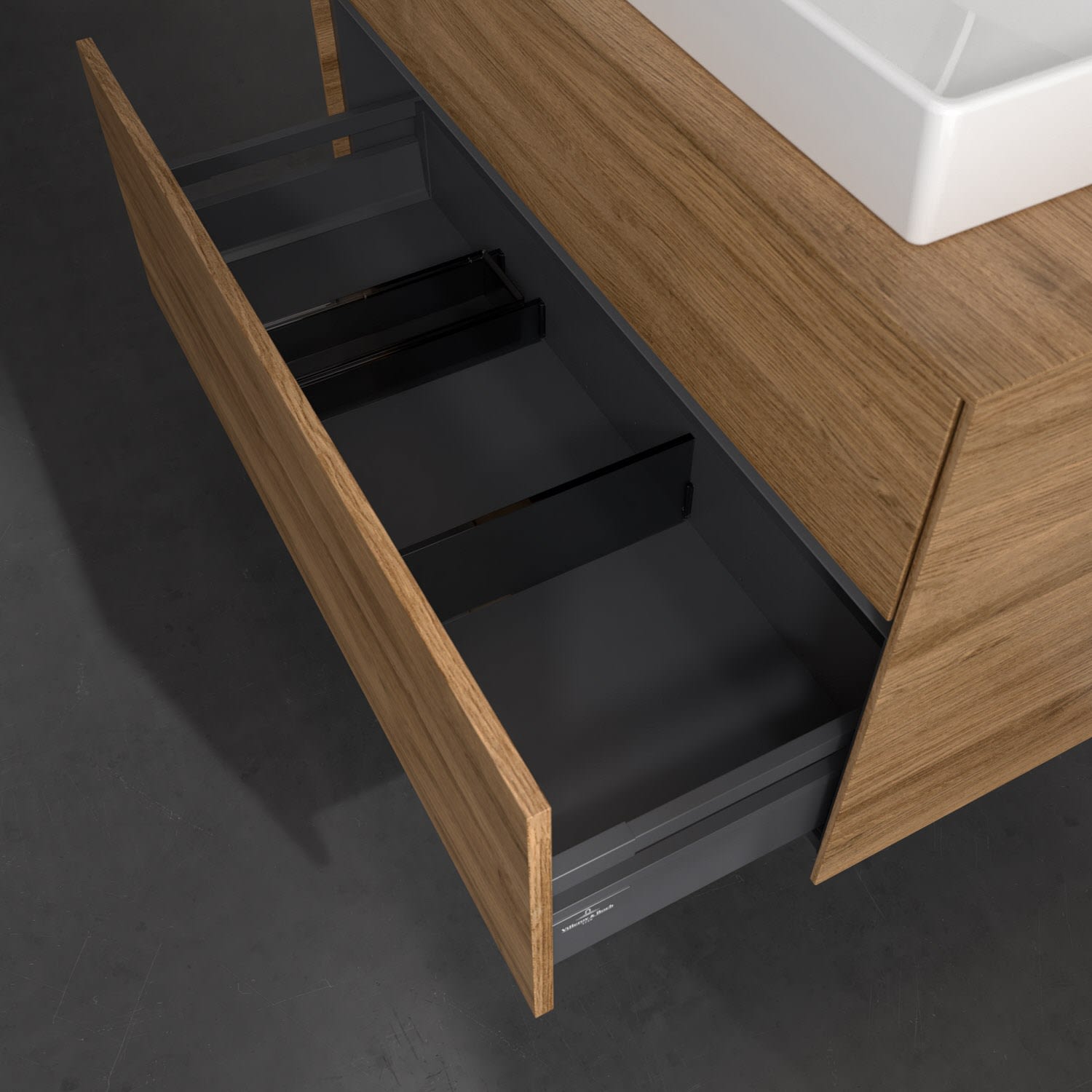 Stauraumwunder im zeitgemäßen Design: Der Villeroy & Boch Waschbeckenunterschrank aus der Collaro Kollektion eignet sich besonders für Familienbäder und bietet genau den Platz, der dort benötigt wird. Eine Griffleiste mit integrierter, stufenlos einstellbarer LED-Beleuchtung sorgt für eine schlichte, stimmungsvolle Front. Steuern lässt sich das Licht über einen Touch-Sensor seitlich am Unterschrank. Im Inneren bietet das Möbelstück mit vier Auszügen erstaunlich viel Komfort – ermöglicht durch großzügiges Platzangebot und integrierte Antirutschmatten. Variabel setzbare Glasabtrennungen und mitgelieferte Accessory Boxen sorgen für den nötigen Überblick. Dank SoftClosing und Selbsteinzug lassen sich die Auszüge nach der Nutzung lautlos schließen.
