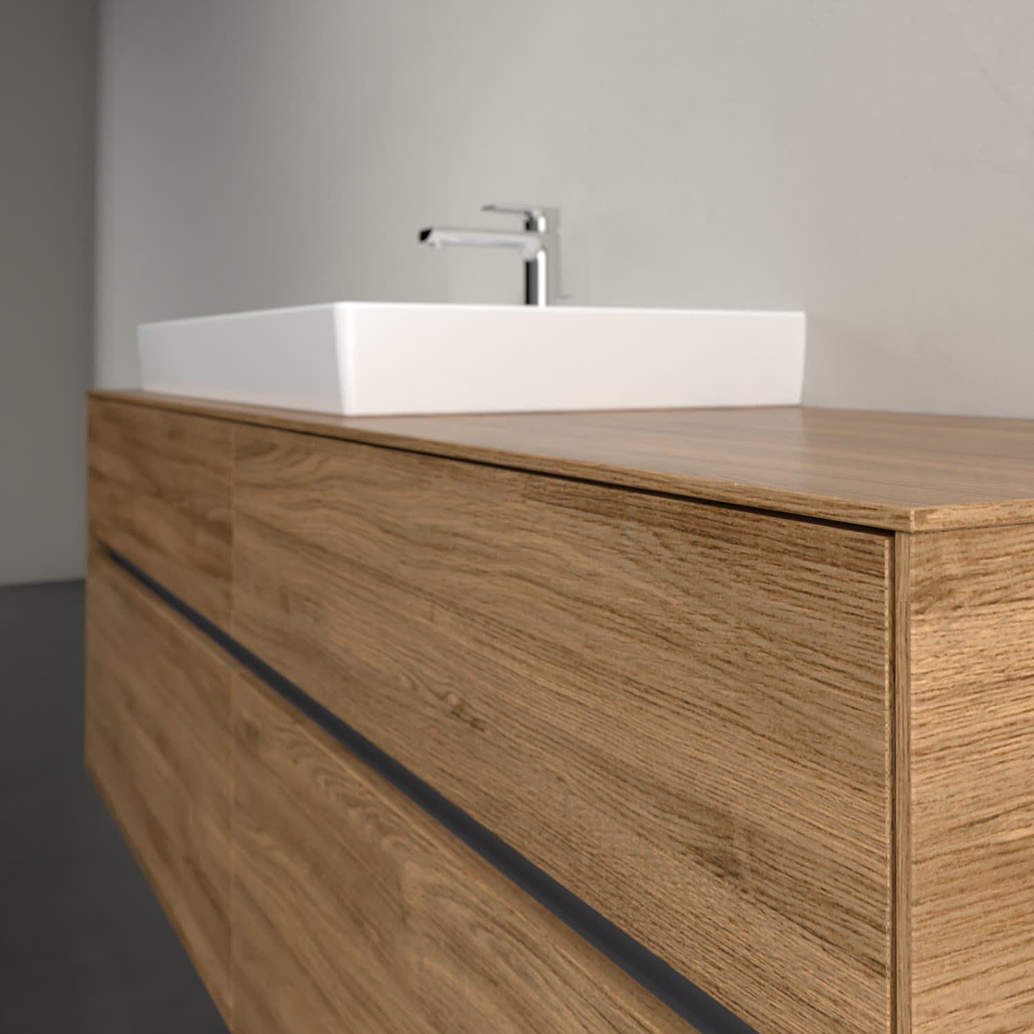 Stauraumwunder im zeitgemäßen Design: Der Villeroy & Boch Waschbeckenunterschrank aus der Collaro Kollektion eignet sich besonders für Familienbäder und bietet genau den Platz, der dort benötigt wird. Eine Griffleiste mit integrierter, stufenlos einstellbarer LED-Beleuchtung sorgt für eine schlichte, stimmungsvolle Front. Steuern lässt sich das Licht über einen Touch-Sensor seitlich am Unterschrank. Im Inneren bietet das Möbelstück mit vier Auszügen erstaunlich viel Komfort – ermöglicht durch großzügiges Platzangebot und integrierte Antirutschmatten. Variabel setzbare Glasabtrennungen und mitgelieferte Accessory Boxen sorgen für den nötigen Überblick. Dank SoftClosing und Selbsteinzug lassen sich die Auszüge nach der Nutzung lautlos schließen.
